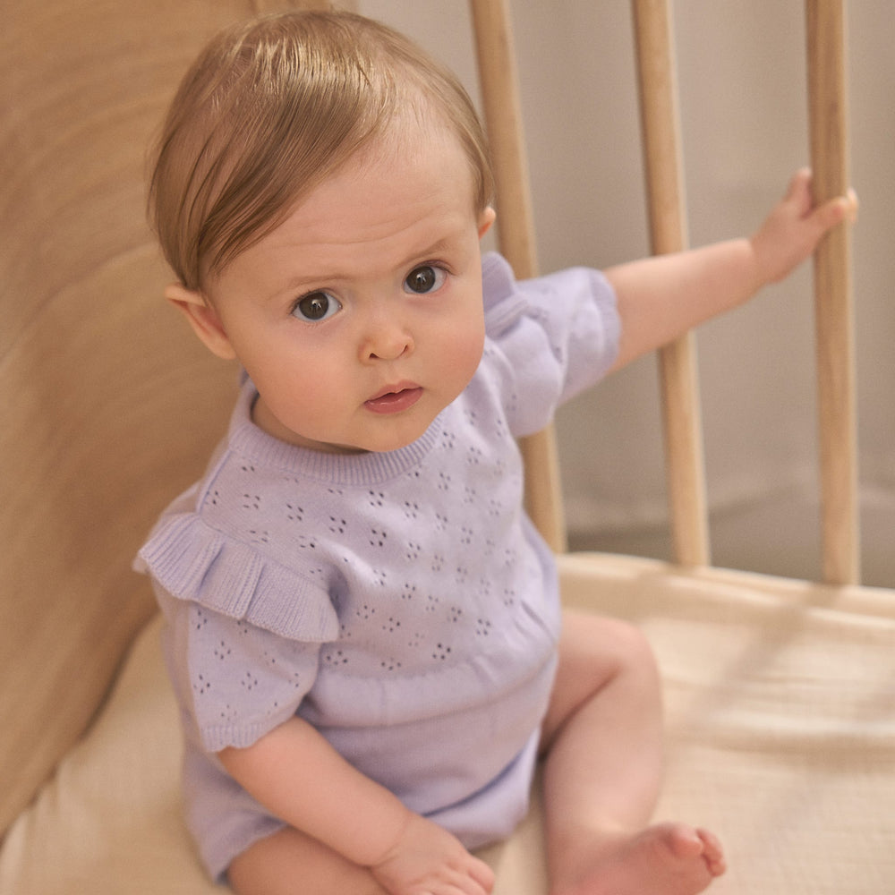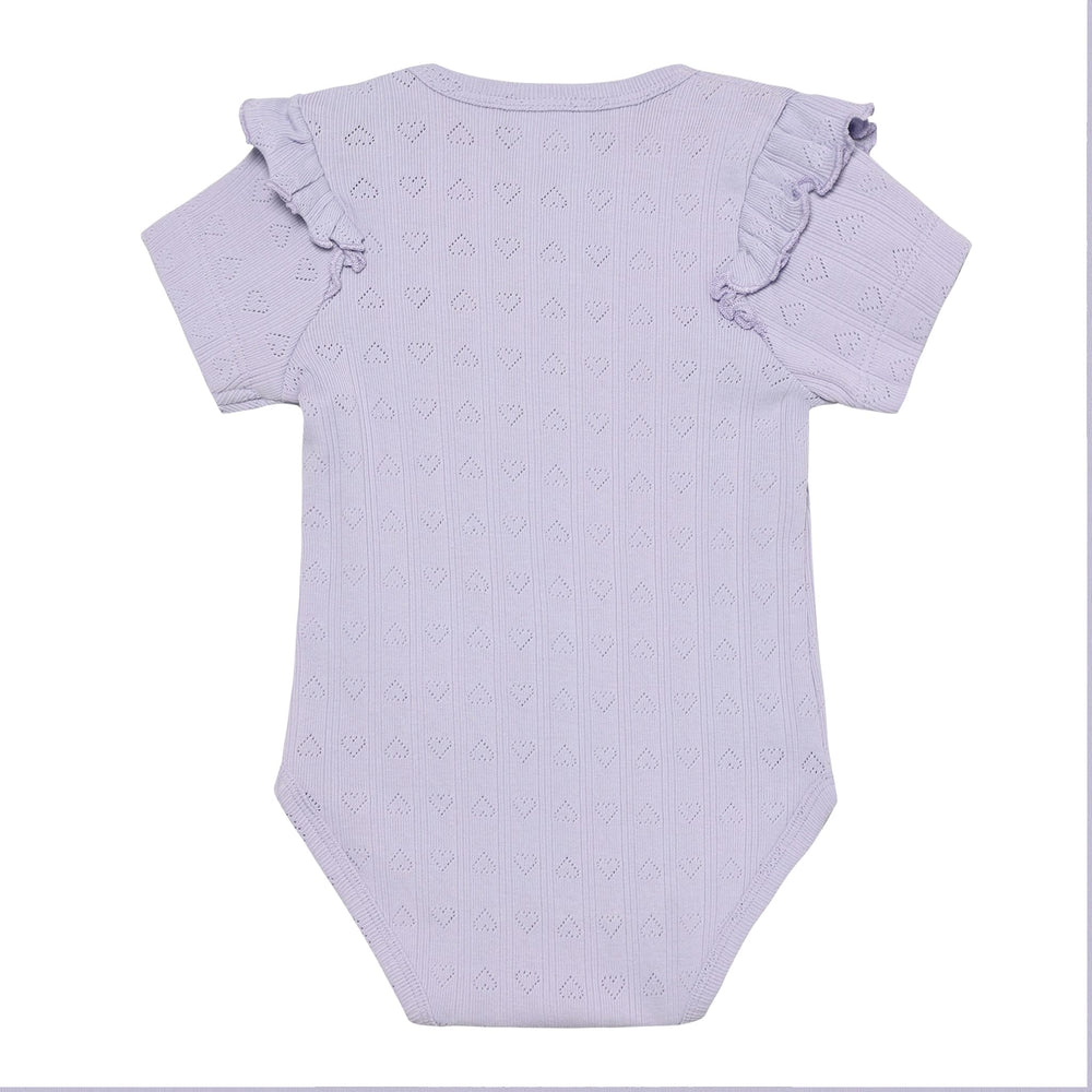 Short sleeved body from EN FANT. This body has flounce at the shoulder and is made in a pointelle quality. There is a cute pattern in the pointelle. The body can be opened with practical snaps at the shoulder and between the legs.