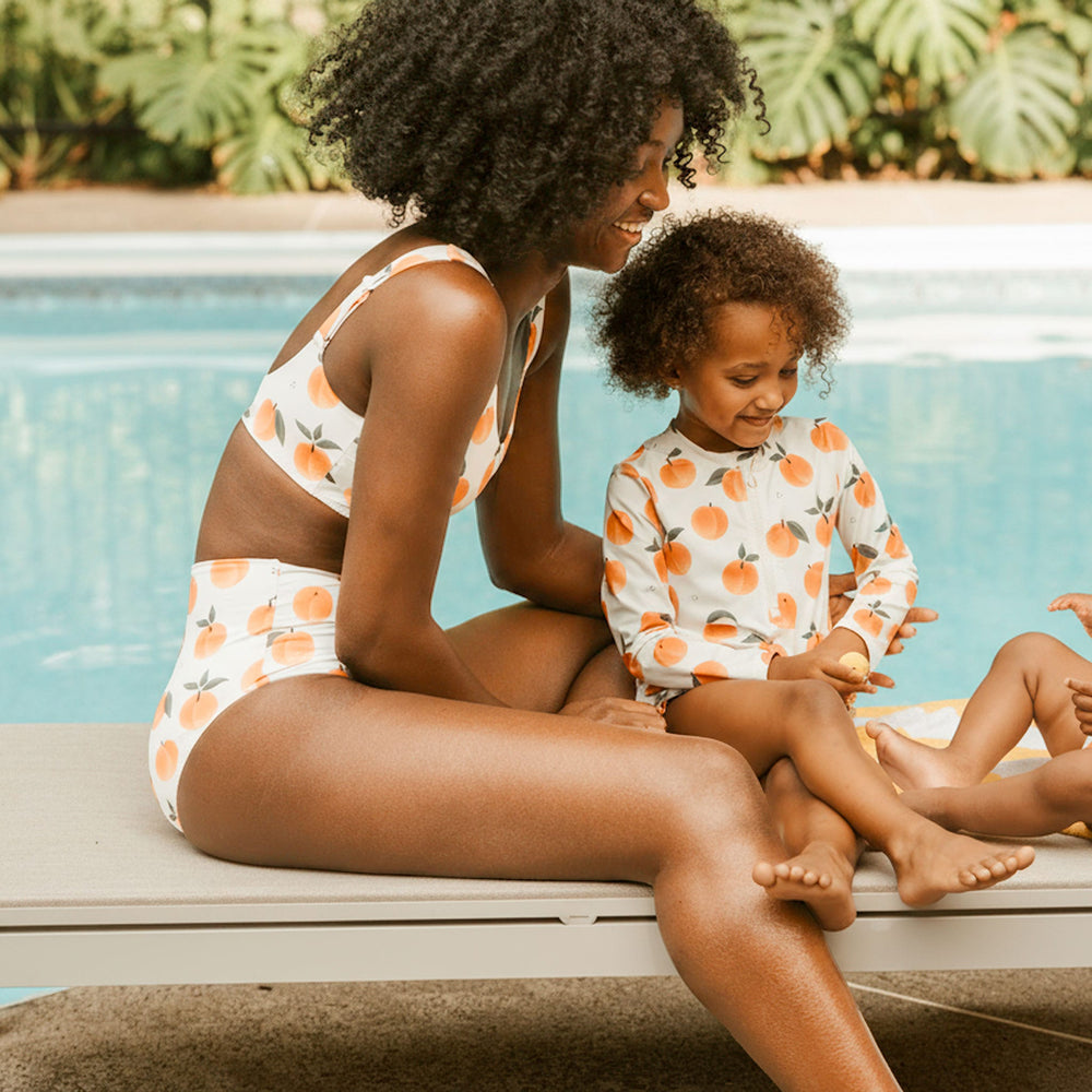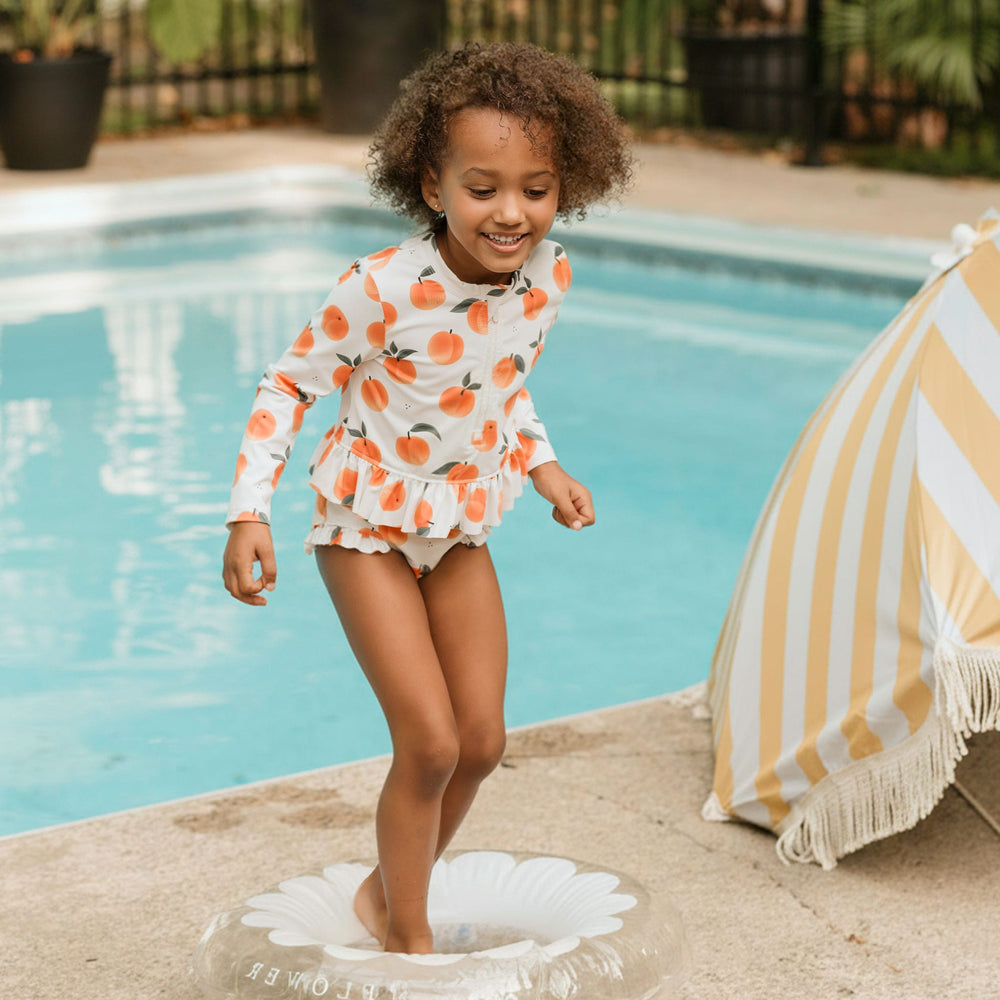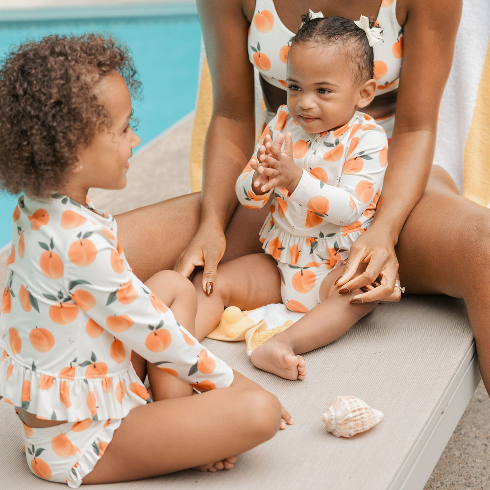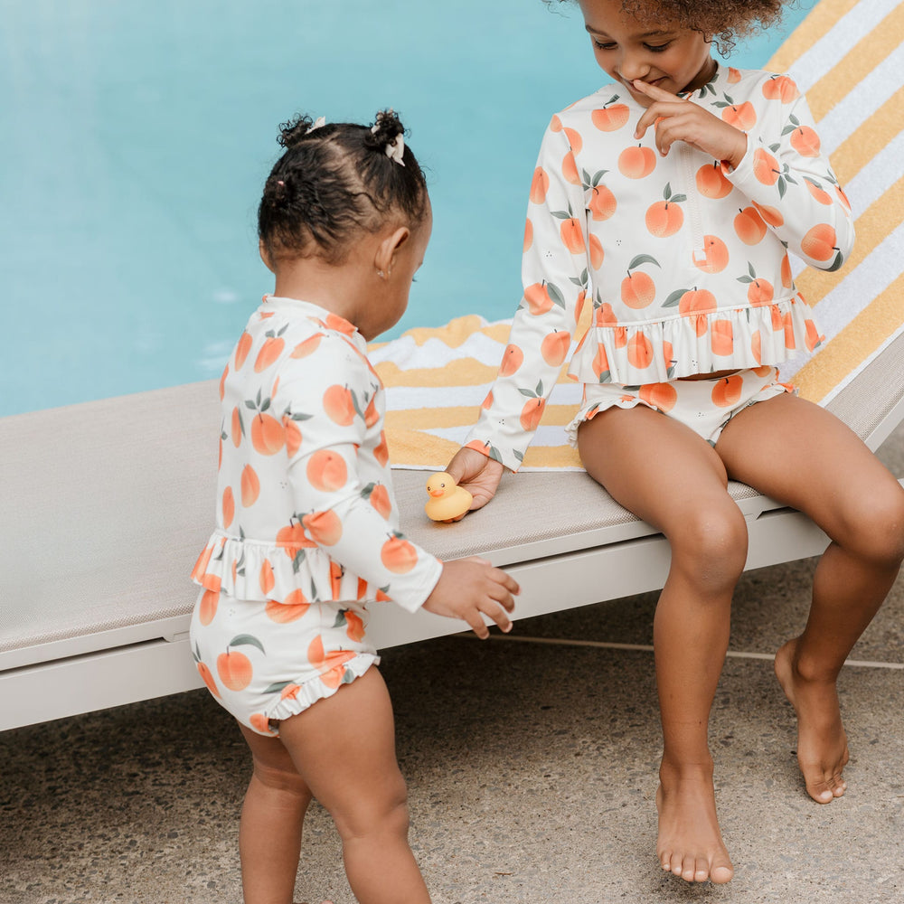 Set her up for sweet summer adventures with this adorable Peaches Print Rash Guard Set. Made for sunny days by the water, this long-sleeved rash guard keeps her covered up while having fun and the ½ zip down the front makes it easy to pull on and off. The coordinating swim bottoms have a frilly trim and keep her comfy while she splashes and plays. Lightweight, quick-drying and designed with built-in UPF50+, she’s free to dive from pool to picnic and back again.