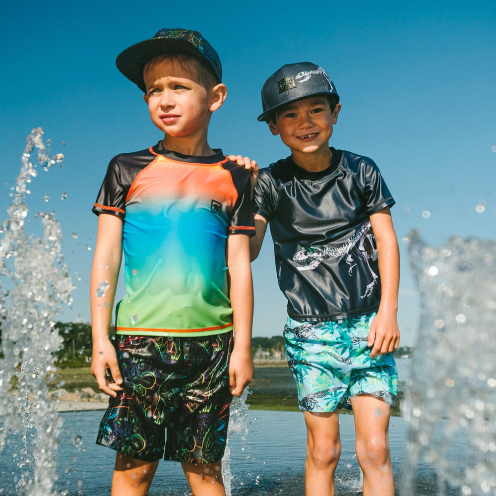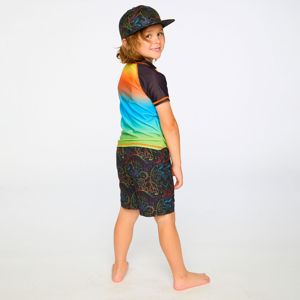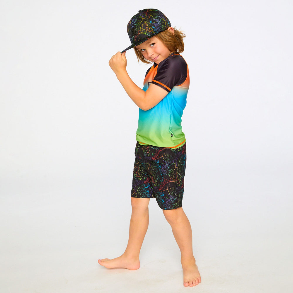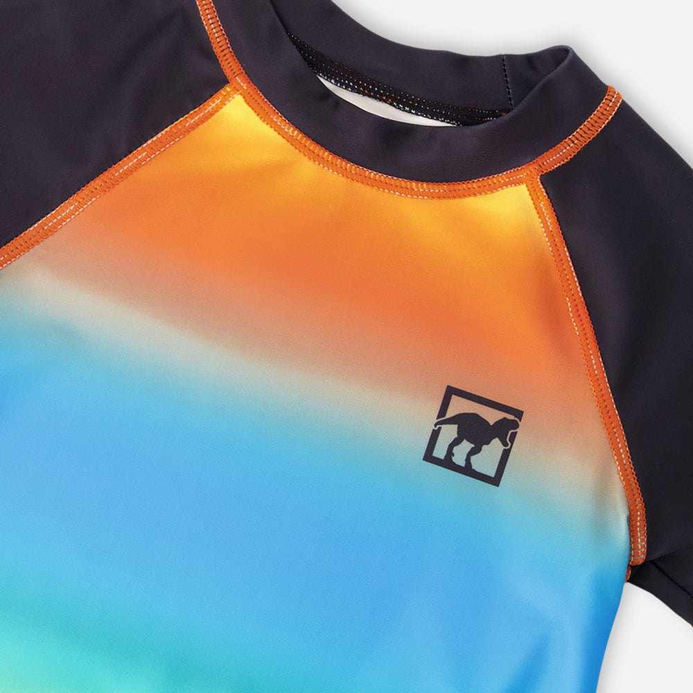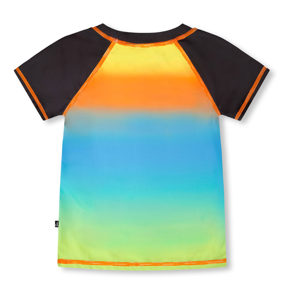 This short sleeve rashguard in orange blue and green gradient brings vibrant color to swim days. This rashguard features a striking ombré effect shifting from orange to blue to green, accented with short contrast sleeves and a small front logo. Made from recycled polyester with added stretch, it provides comfort, quick-drying performance, and sun protection for boys and baby boys.