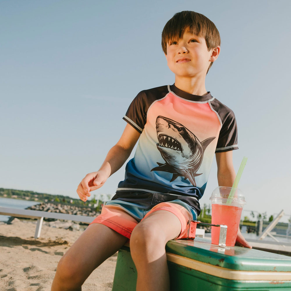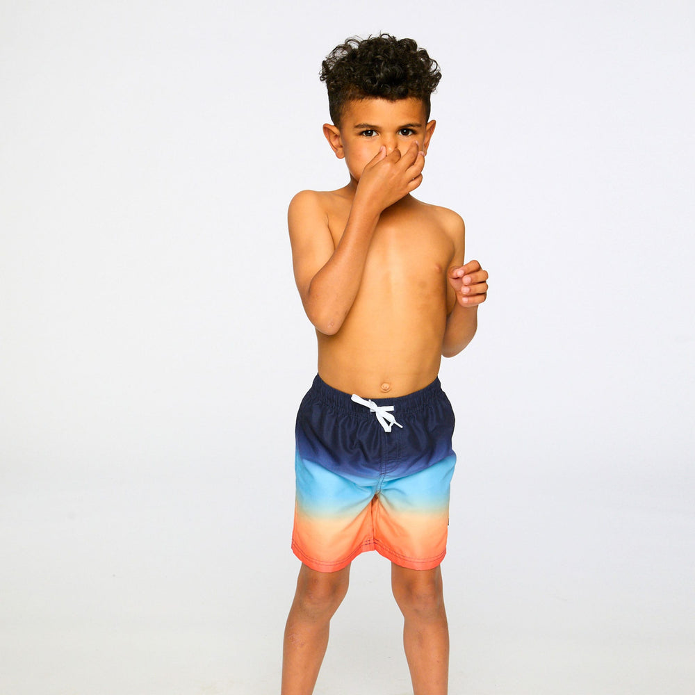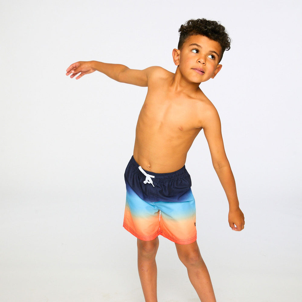 Our swim trunks in blue and orange gradient bring bold summer color to every splash. These above-the-knee swim shorts feature a vibrant ombré effect that shifts from deep blue to bright orange, crafted from lightweight recycled polyester with a breathable mesh lining. Finished with an elastic waist and adjustable drawstring, they combine comfort and style for active beach days.