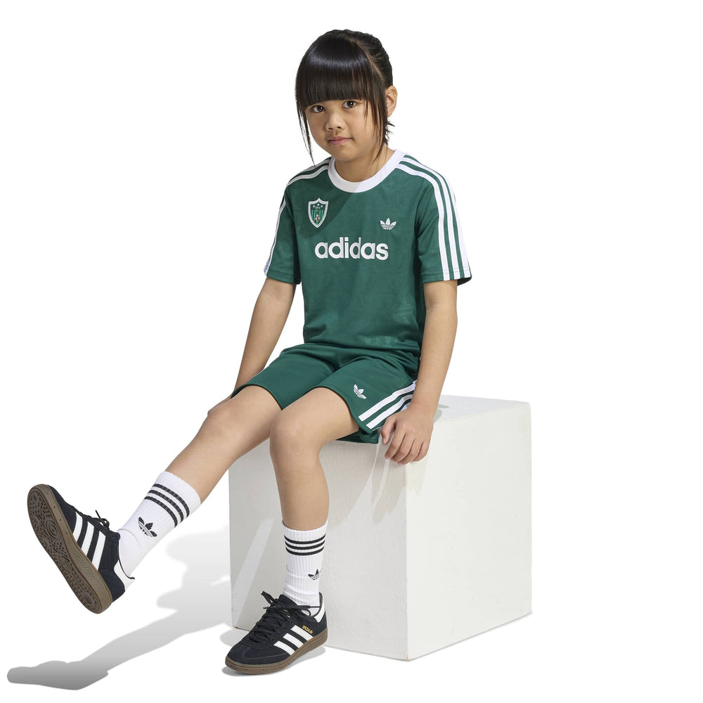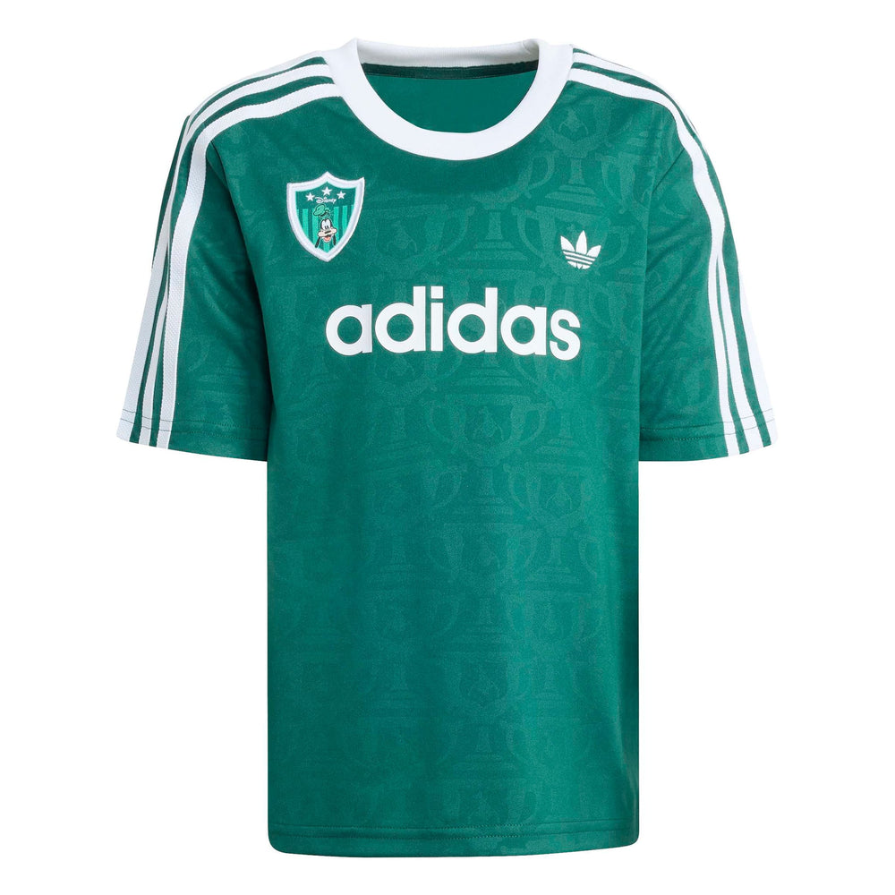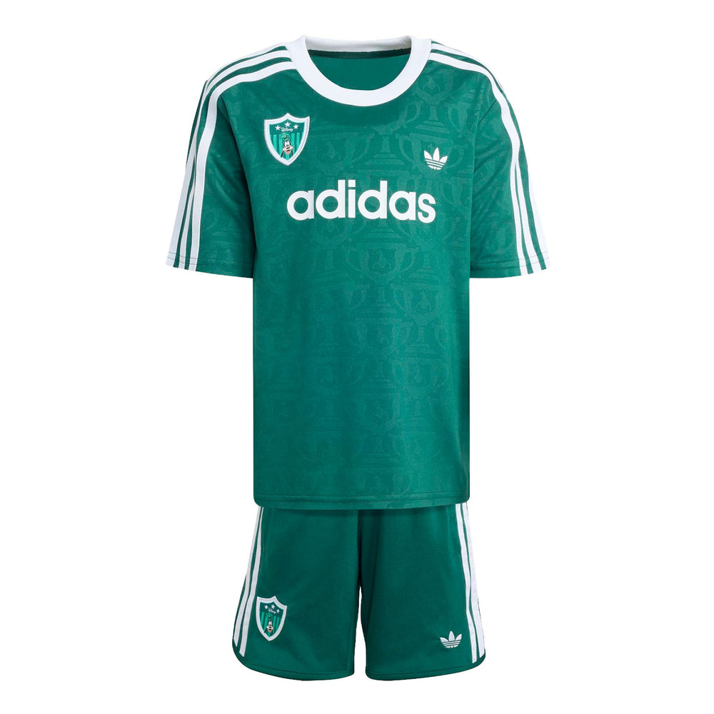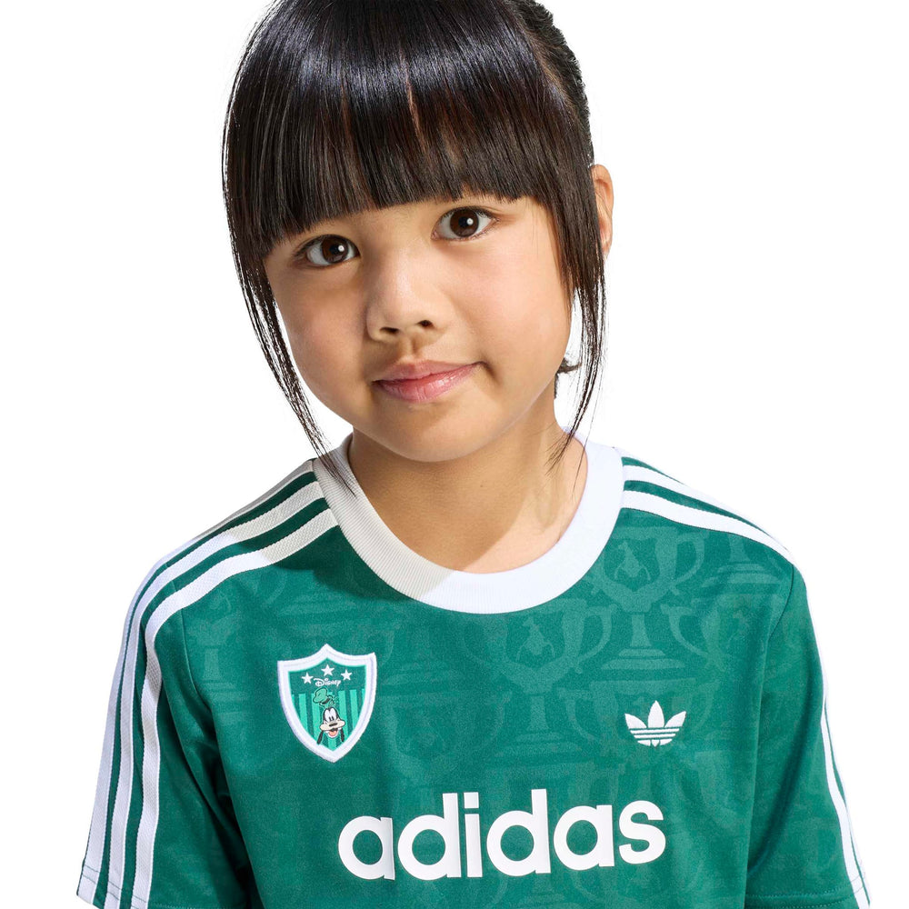 The ADIDAS DISNEY SHORT JERSEY SET for kids combines everyday comfort with a dash of Disney charm. This set features a loose-fitting top and regular bottom, perfect for active play and relaxation. The drawstring waist ensures a snug fit, while the knit fabric offers a soft touch against the skin. Celebrate the joy of football with Goofy, making it a delightful addition to any child's wardrobe.