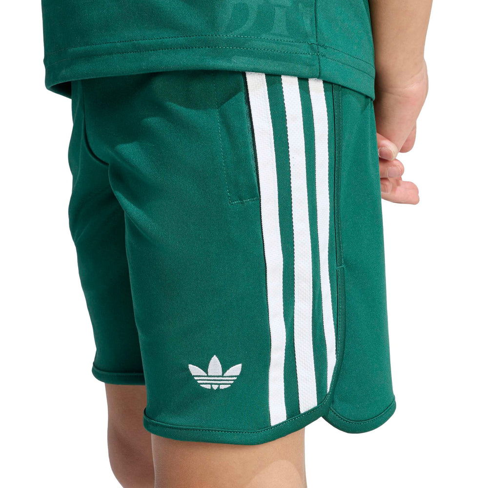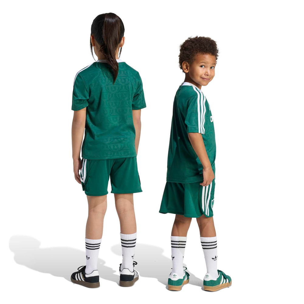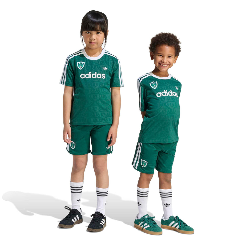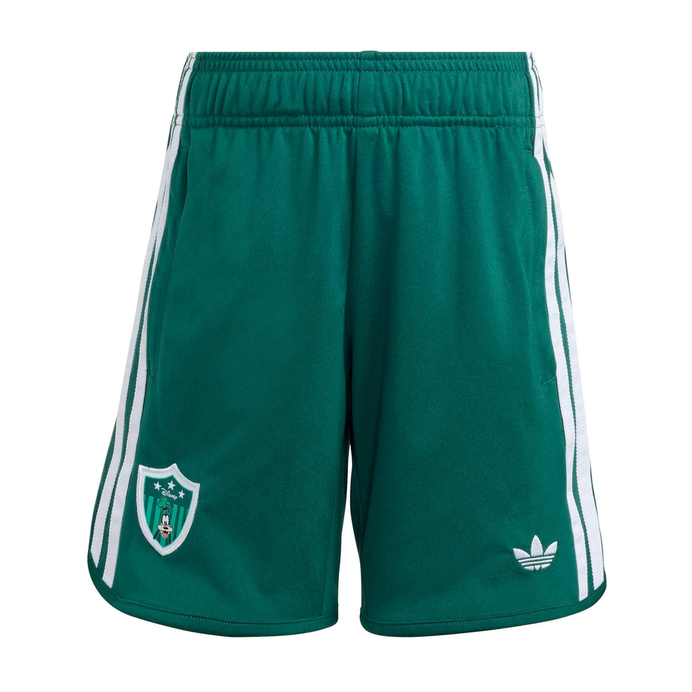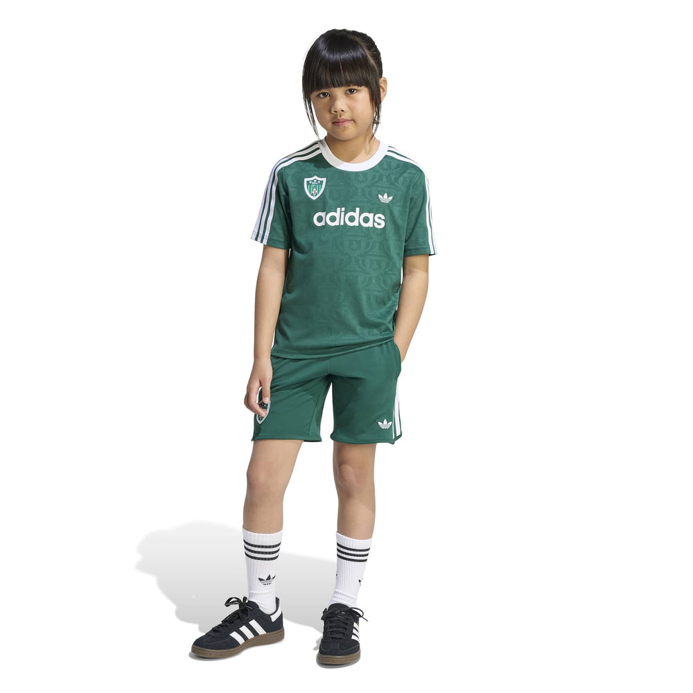 The ADIDAS DISNEY SHORT JERSEY SET for kids combines everyday comfort with a dash of Disney charm. This set features a loose-fitting top and regular bottom, perfect for active play and relaxation. The drawstring waist ensures a snug fit, while the knit fabric offers a soft touch against the skin. Celebrate the joy of football with Goofy, making it a delightful addition to any child's wardrobe.