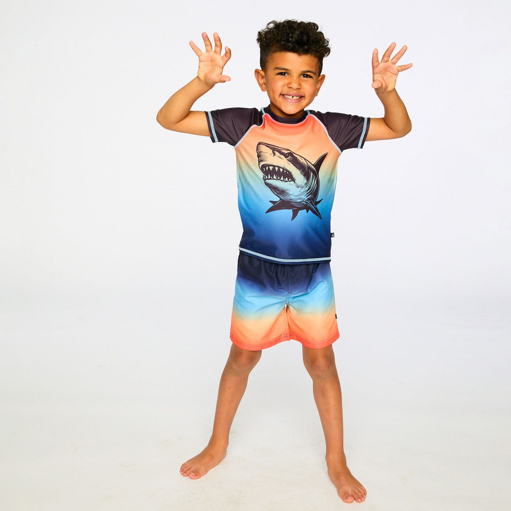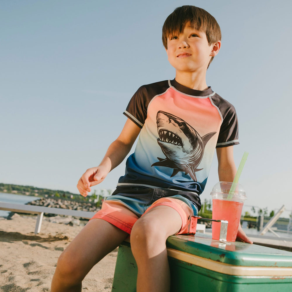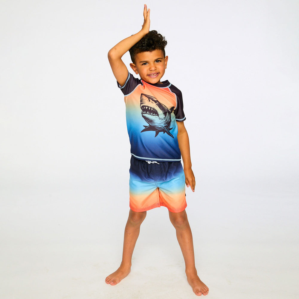 This short sleeve rashguard in blue and orange gradient adds bold style to summer swimwear. This swim top features a vivid ombré effect from bright orange to deep blue, accented with short sleeves and a large shark graphic on the front. Crafted from recycled polyester with stretch, it offers comfort, quick-drying performance, and protection for boys during water play.