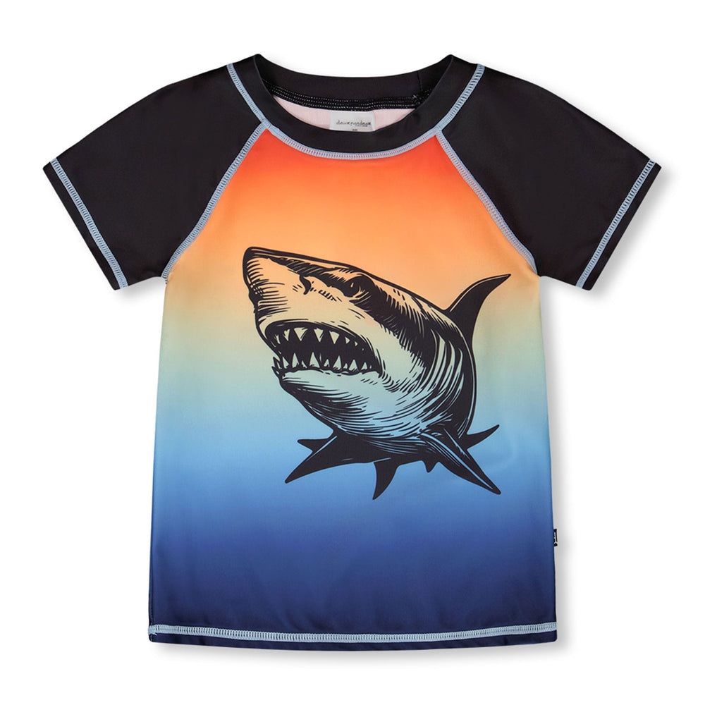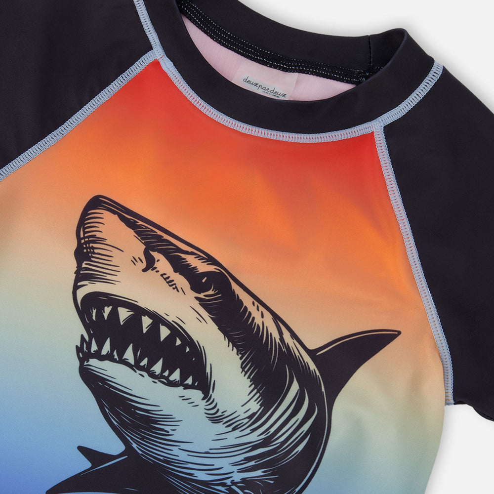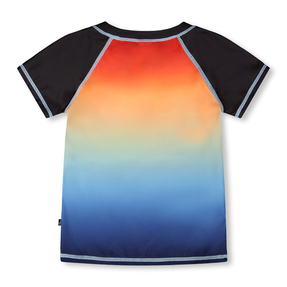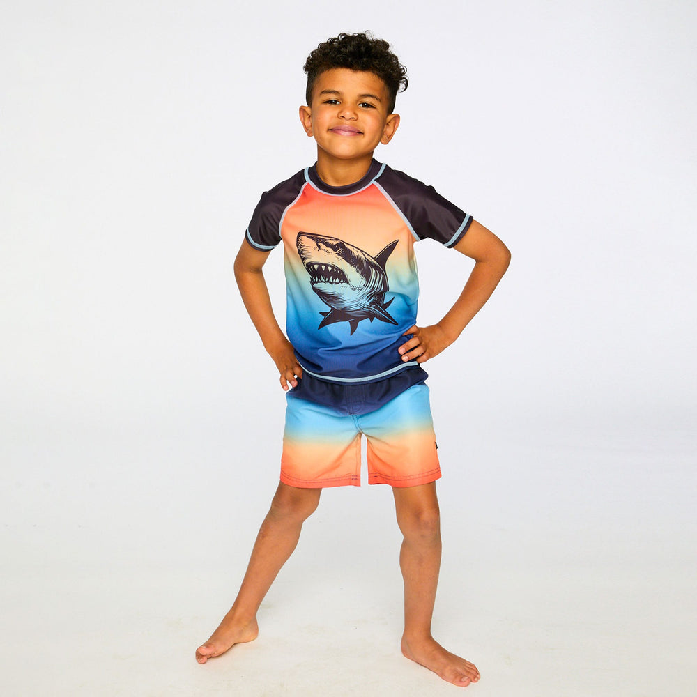 This short sleeve rashguard in blue and orange gradient adds bold style to summer swimwear. This swim top features a vivid ombré effect from bright orange to deep blue, accented with short sleeves and a large shark graphic on the front. Crafted from recycled polyester with stretch, it offers comfort, quick-drying performance, and protection for boys during water play.