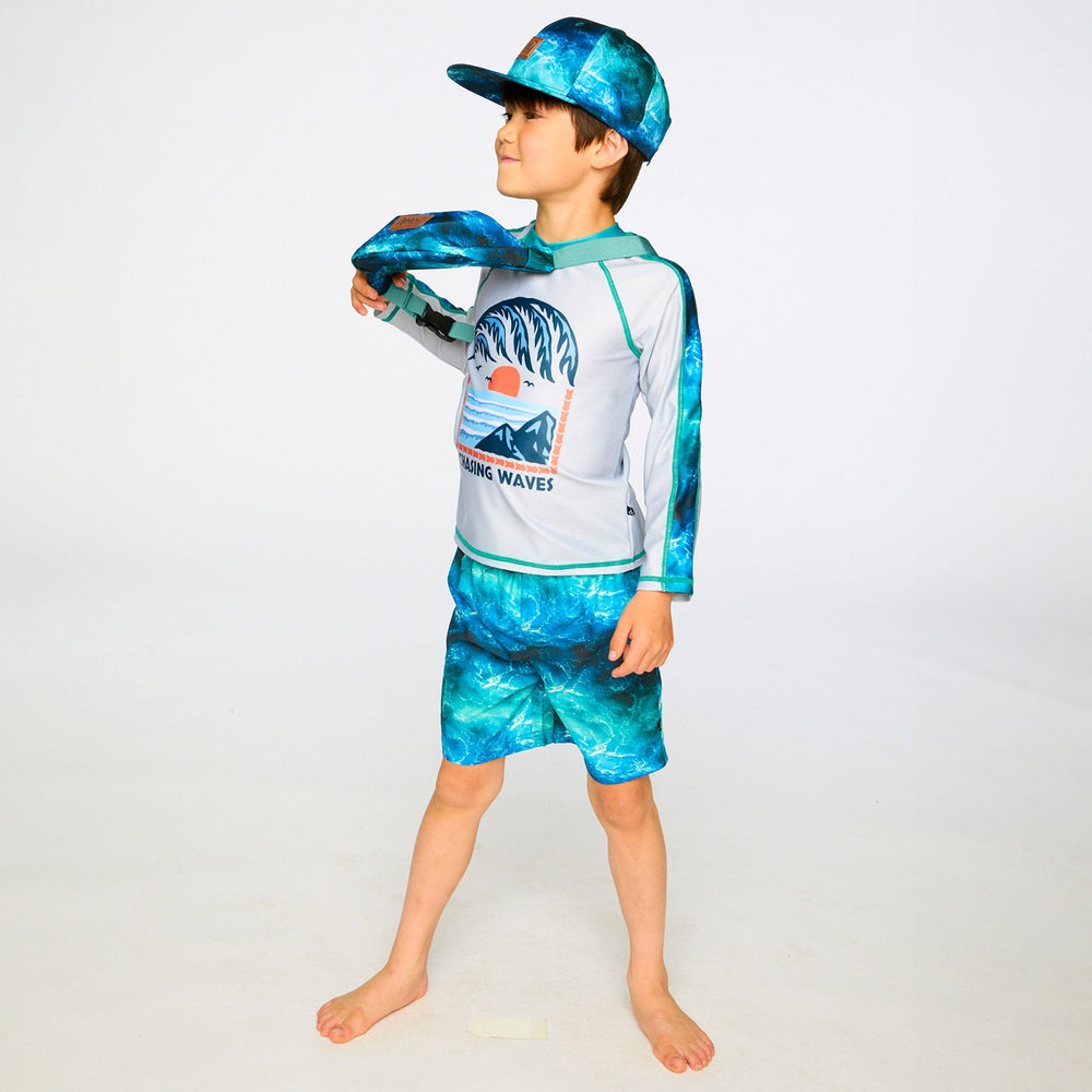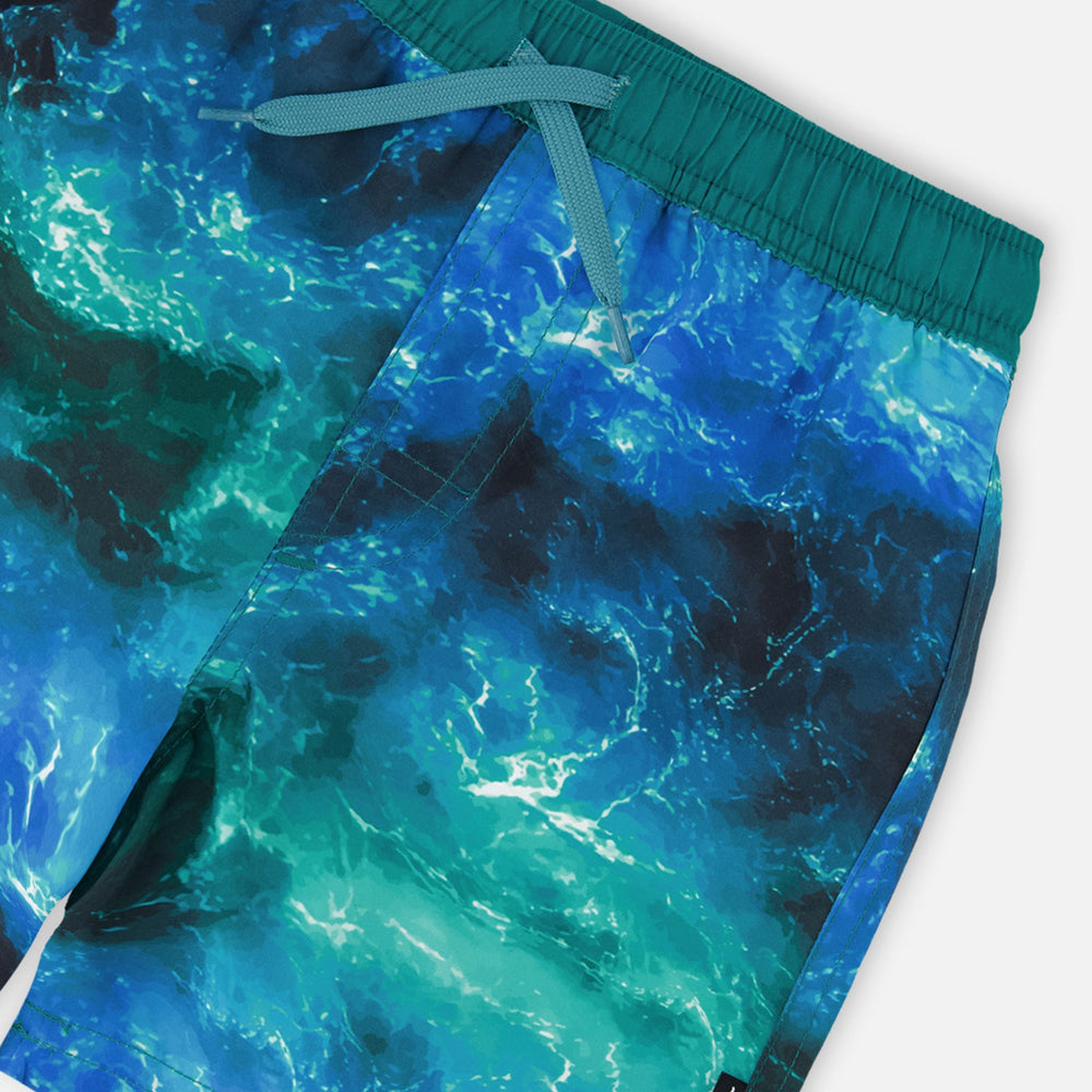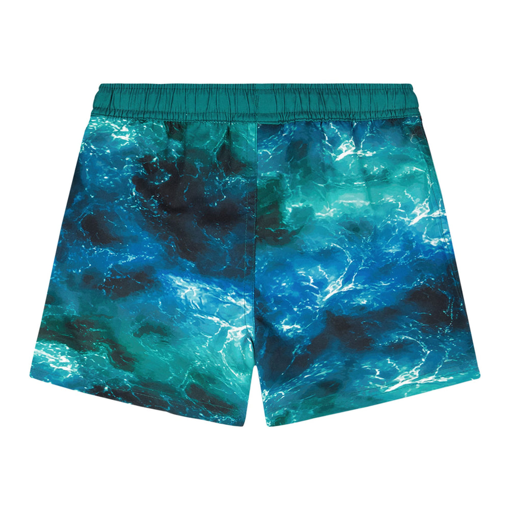 The swim trunks in blue with waves print capture the spirit of the ocean for summer adventures. These above-the-knee swim shorts feature a striking allover wave effect print in rich shades of blue, crafted in lightweight recycled polyester with a breathable mesh lining. An elastic waist with adjustable drawstring ensures a secure and comfortable fit for boys during all-day water play.