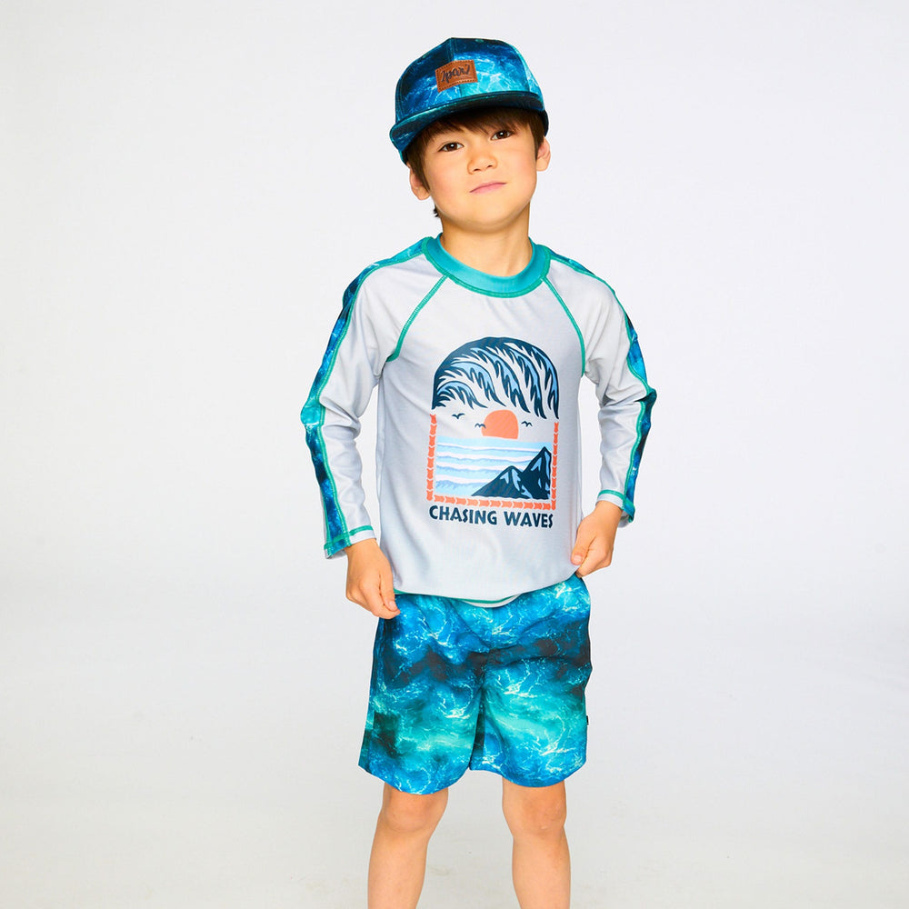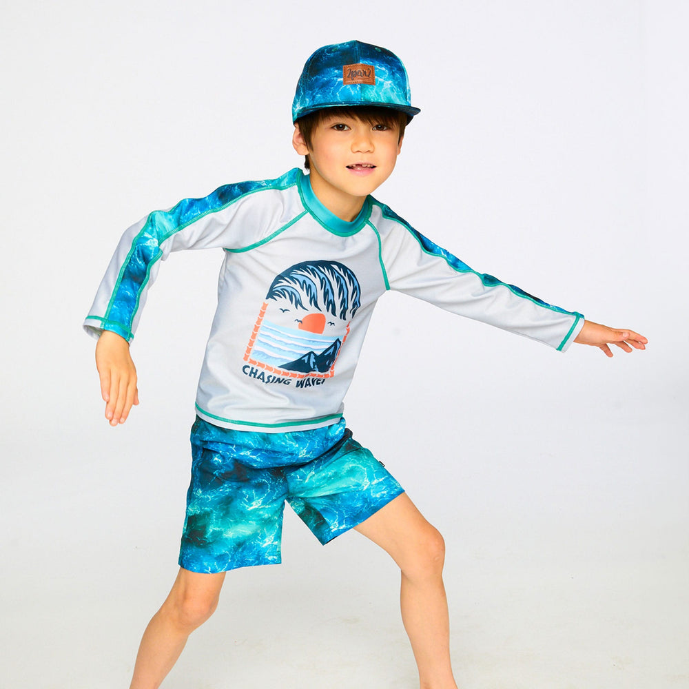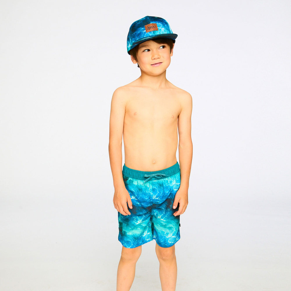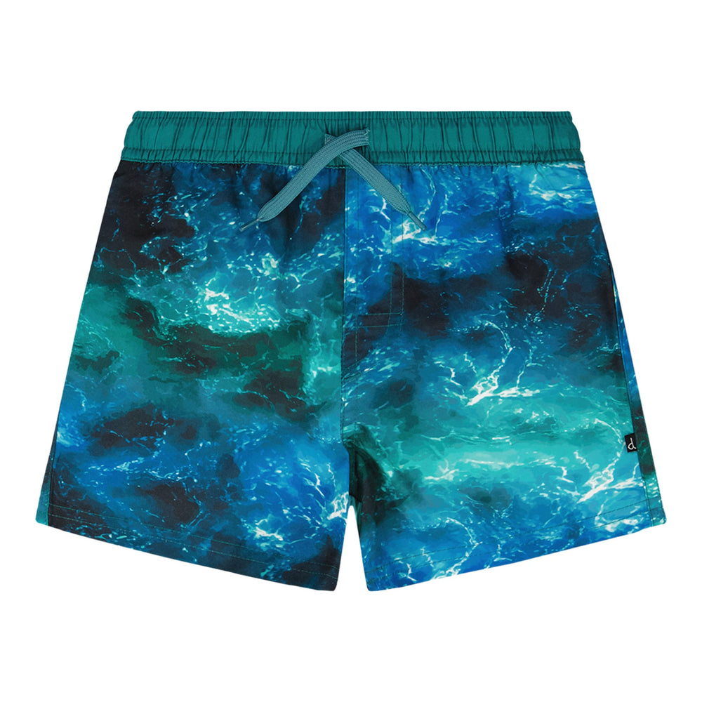 The swim trunks in blue with waves print capture the spirit of the ocean for summer adventures. These above-the-knee swim shorts feature a striking allover wave effect print in rich shades of blue, crafted in lightweight recycled polyester with a breathable mesh lining. An elastic waist with adjustable drawstring ensures a secure and comfortable fit for boys during all-day water play.