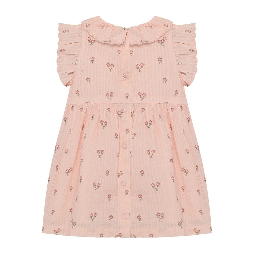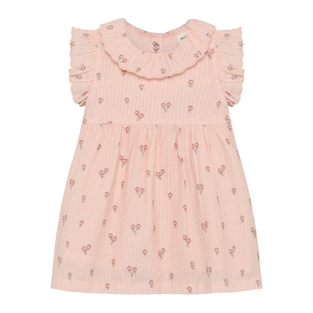 Sleeveless dress from Minymo. The dress has an all-over print. It features ruffles at the collar and on the shoulders. The dress is made of 100% cotton.