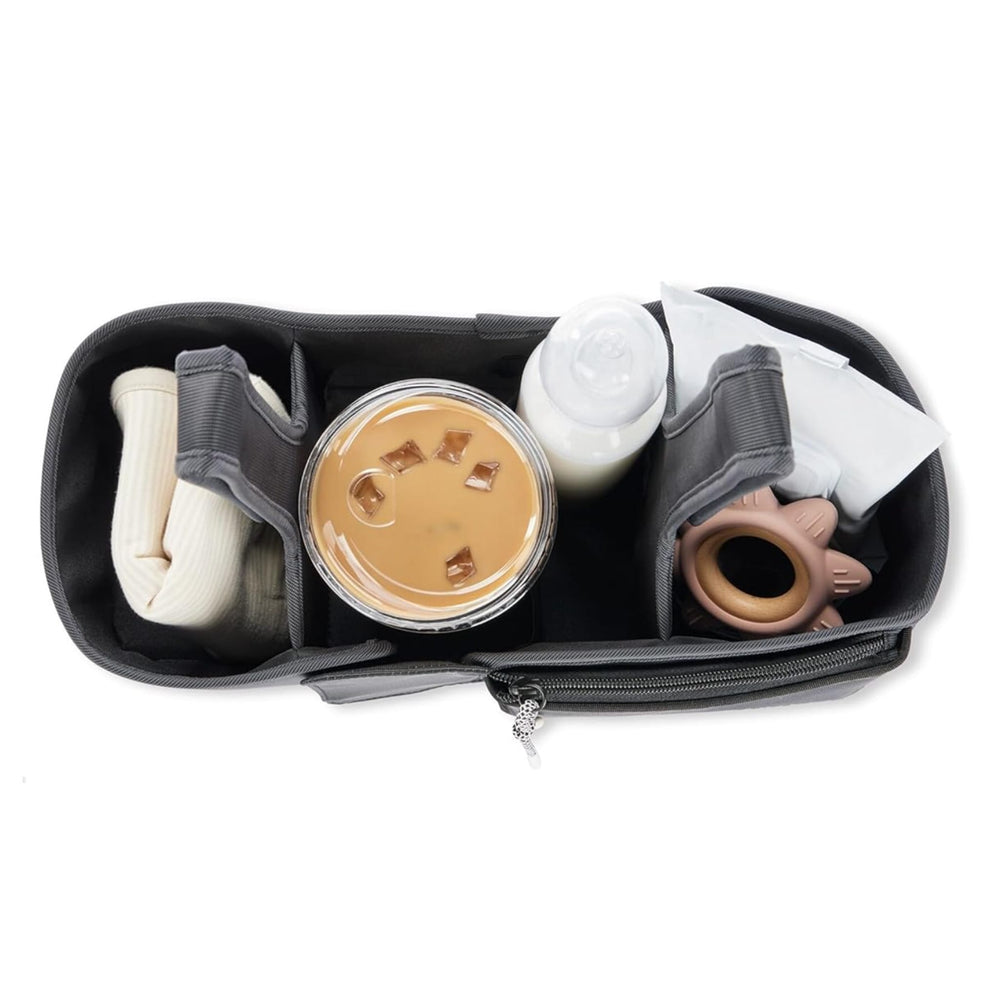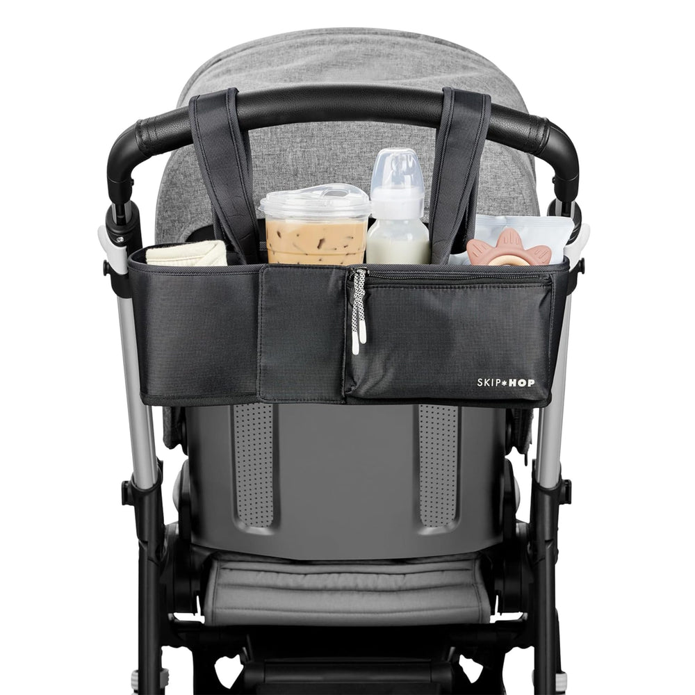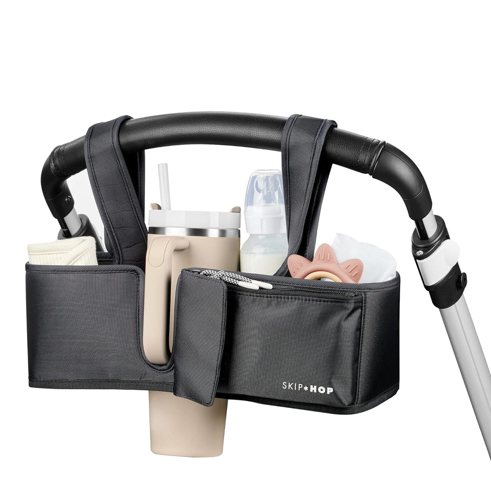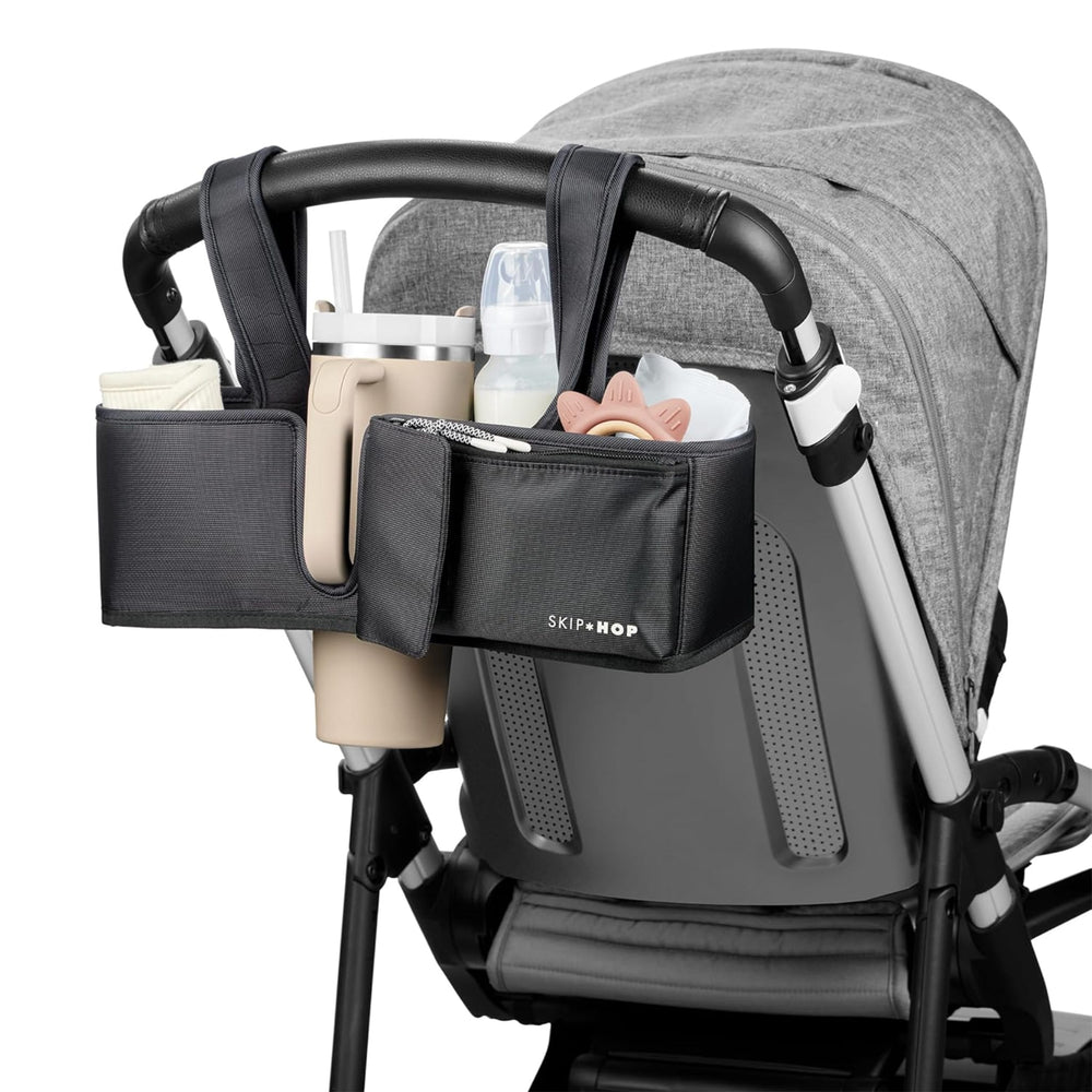 Thanks to its innovative convertible design, this must-have stroller accessory securely holds large tumblers up to 40 oz. The stroller caddy keeps drinks, baby bottles, coffee cups, and sippy cups safely in place on every outing.