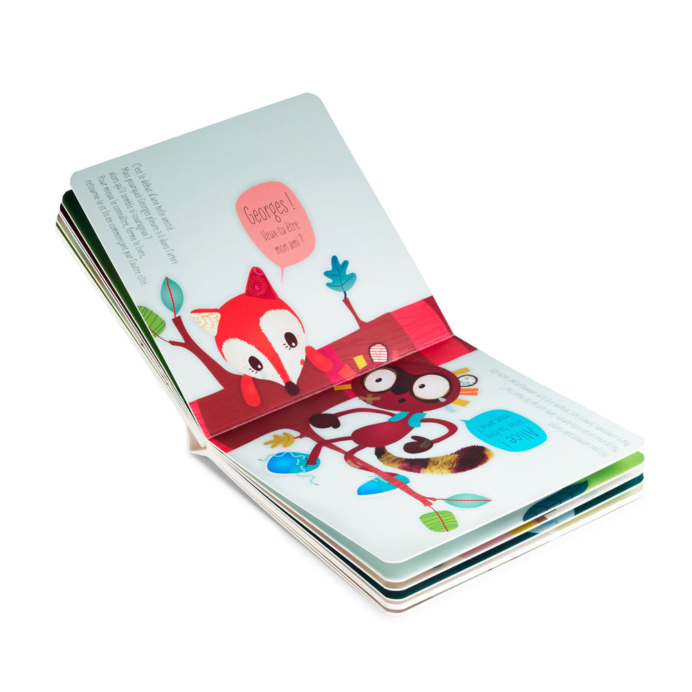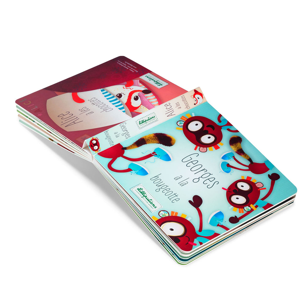 The reversible book Georges a la bougeotte / Alice a les chocottes by Lilliputiens tells the stories of Georges the Lemur and Alice the Vixen, around self-acceptance and the acceptance of others.