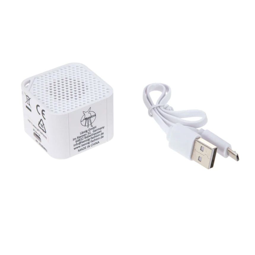 The digital music box comes with a speaker and a USB cable. The battery is rechargeable and has a runtime of 1-2 hours. For the connection to work the device must be within range of about 10 meters and after 5 minutes without a Bluetooth® connection, the speaker automatically turns off.