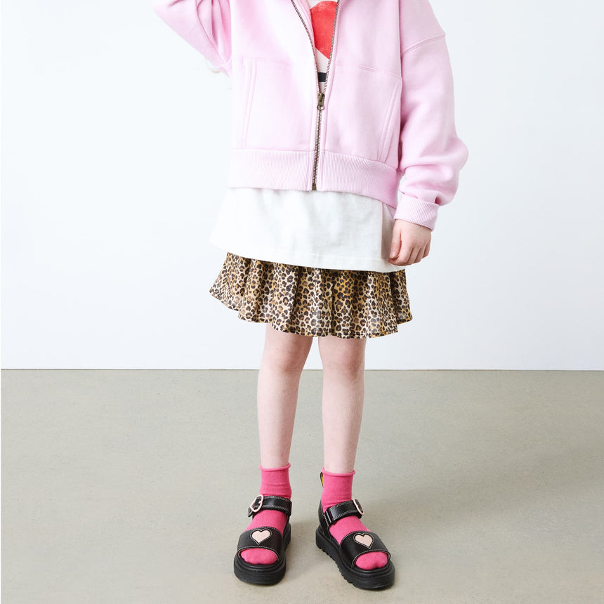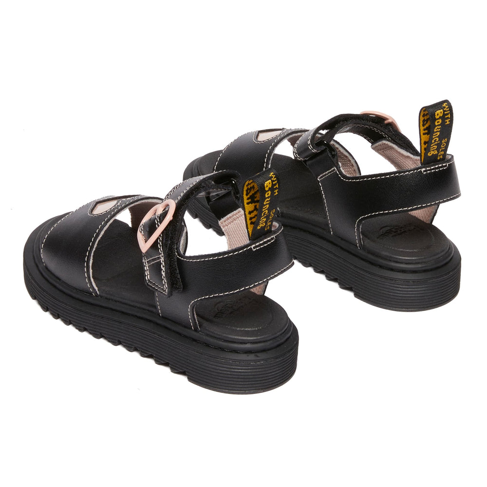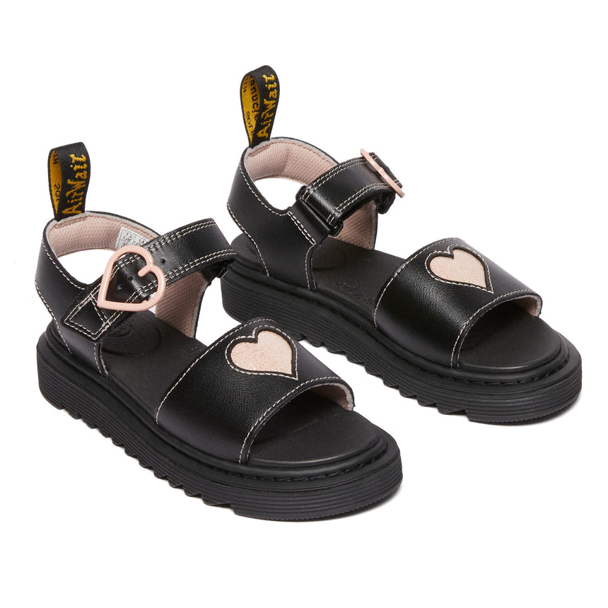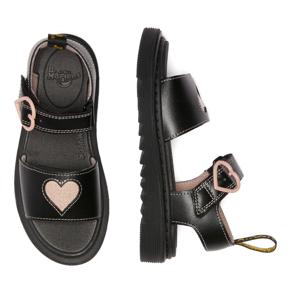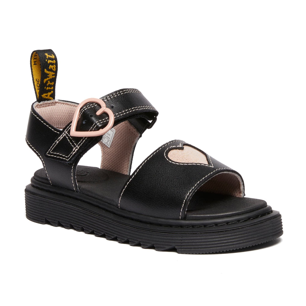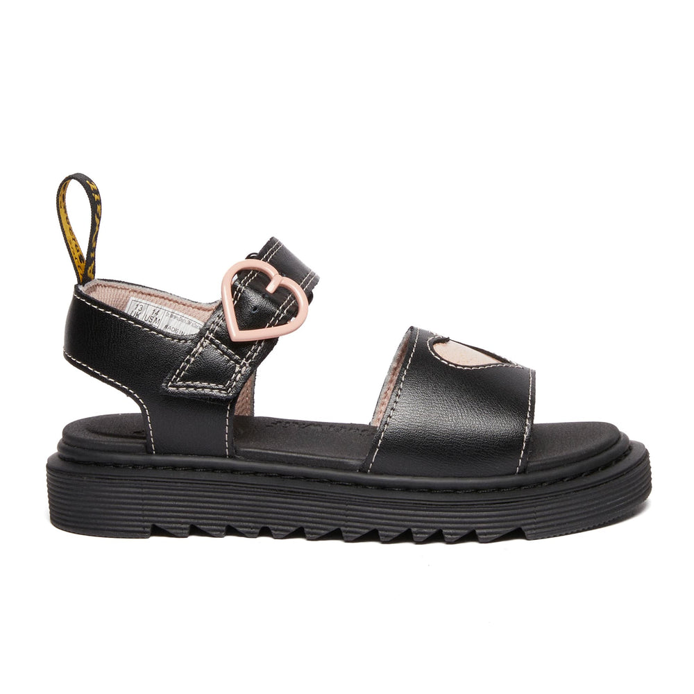 Standout shine, summer after summer. These bold sandals are built from a new DM's leather, Galaxy Shimmer, with a high-shine finish to put little rebels in the spotlight. Detailed with contrast heart cut-outs, a heart-shaped buckle and padded heart underlay, the sandals are set on a kids' edition of DM's lightweight Zebrilus sole. Yellow stitching and a scripted AirWair heel loop mark them as DM's.