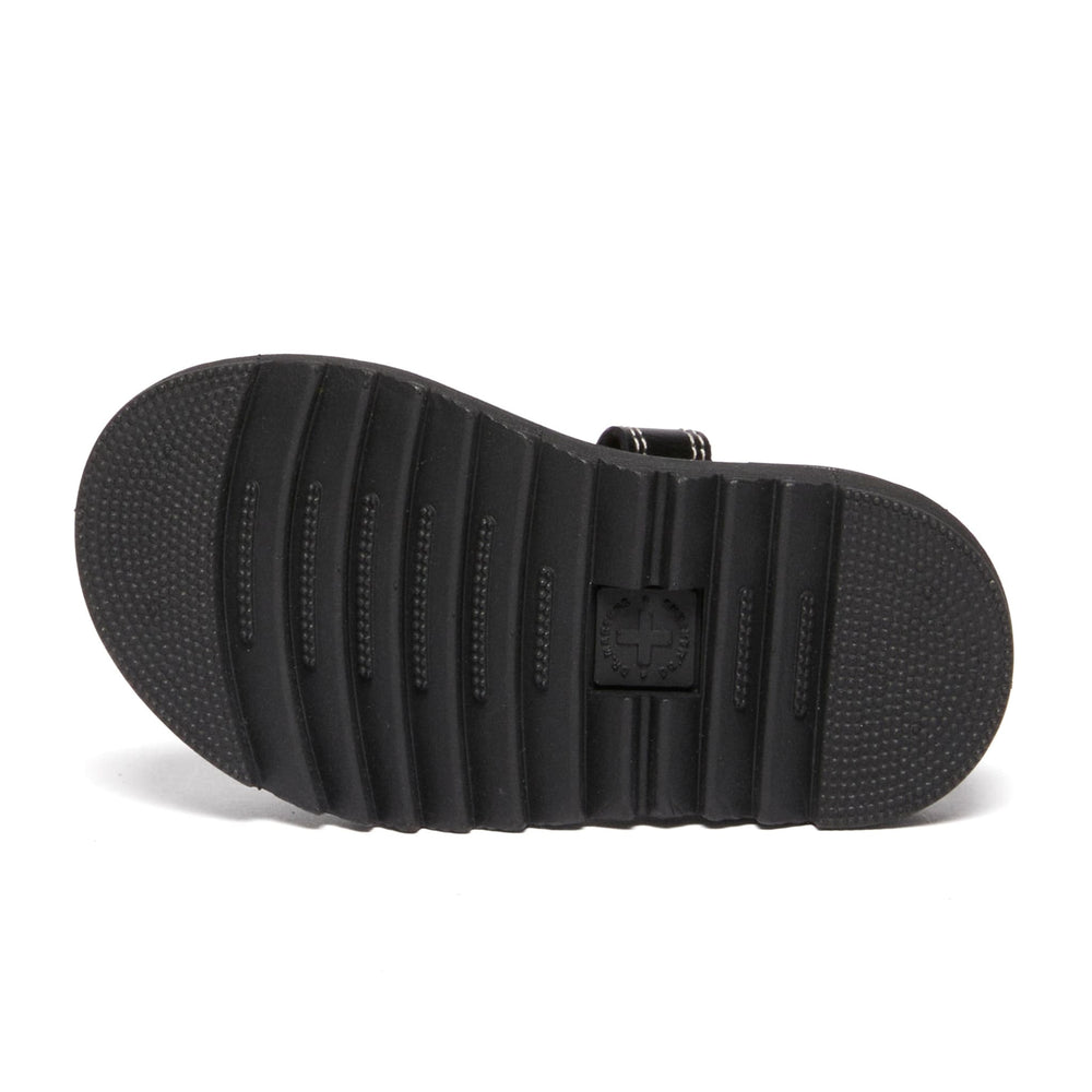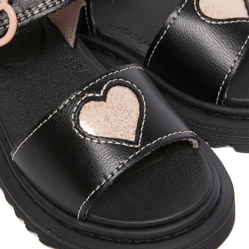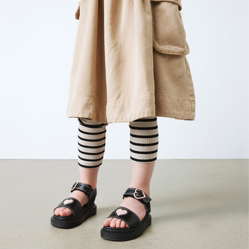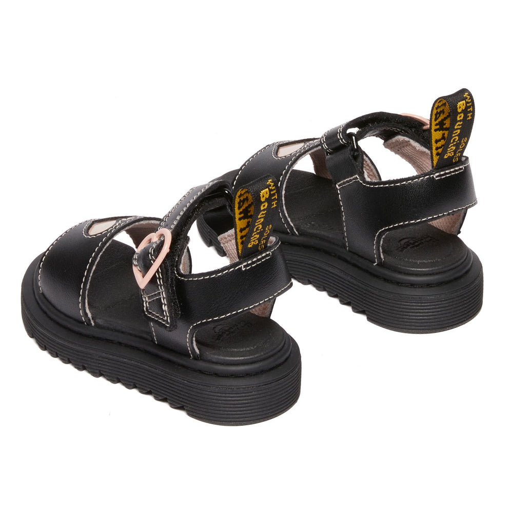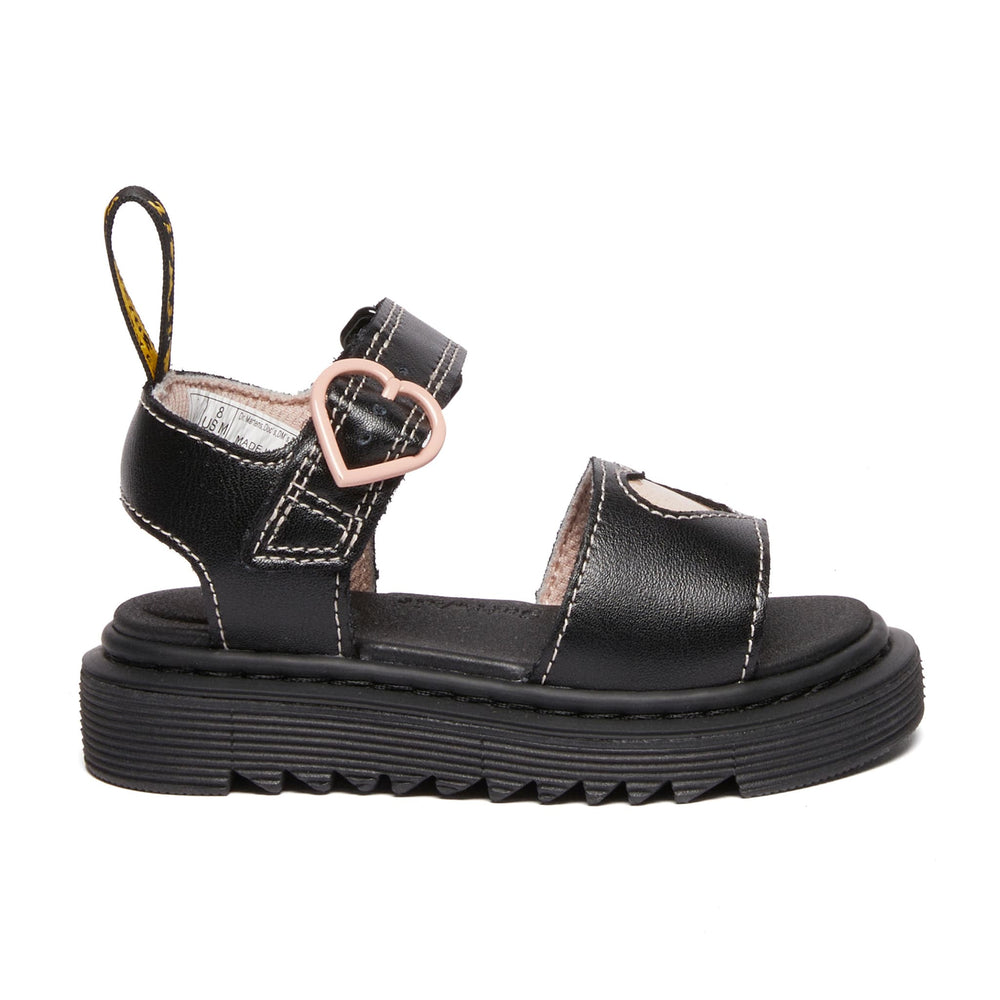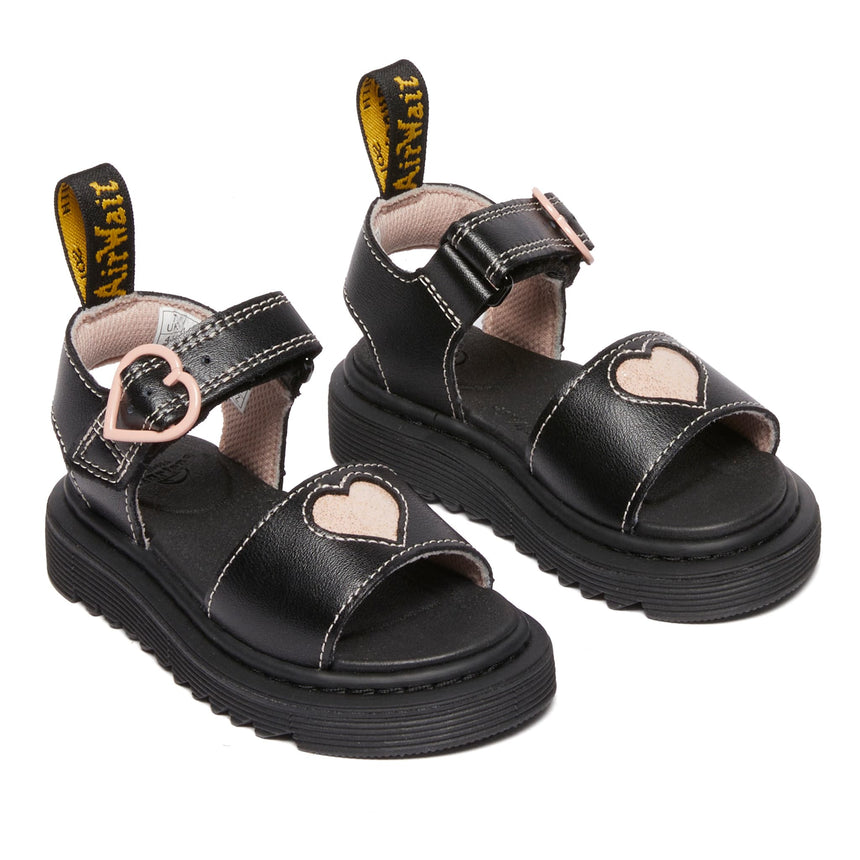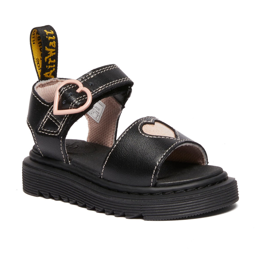 Standout shine, summer after summer. These bold sandals are built from a new DM's leather, Galaxy Shimmer, with a high-shine finish to put little rebels in the spotlight. Detailed with contrast heart cut-outs, a heart-shaped buckle and padded heart underlay, the sandals are set on a kids' edition of DM's lightweight Zebrilus sole. Yellow stitching and a scripted AirWair heel loop mark them as DM's.