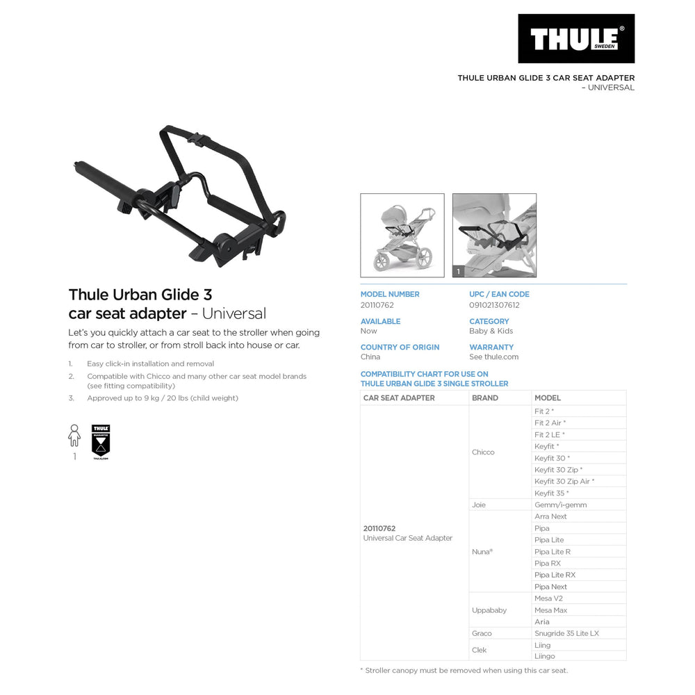 Compatible with the Thule Urban Glide 3 Single stroller when used with the universal car seat adapter (20110762).