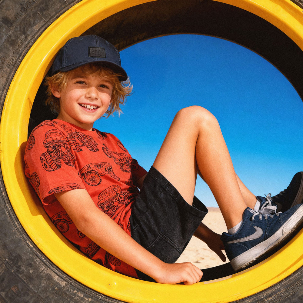 The organic cotton jersey t-shirt in blue with bicycle print is a playful basic for boys who love adventure. This short-sleeve tee showcases a fun bike and car allover print that bring movement and style to the look. Crafted in soft organic cotton jersey with a hint of stretch, it ensures breathability and all-day comfort.