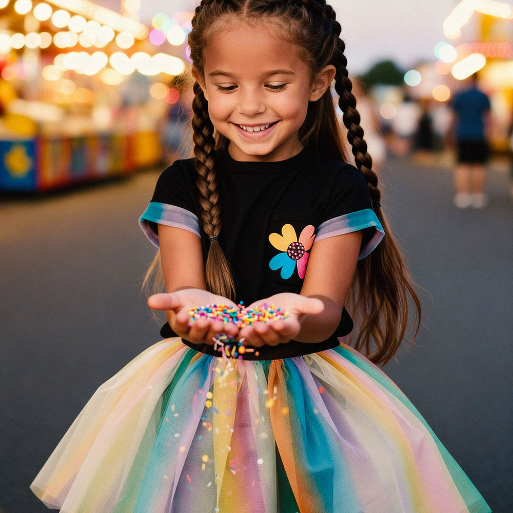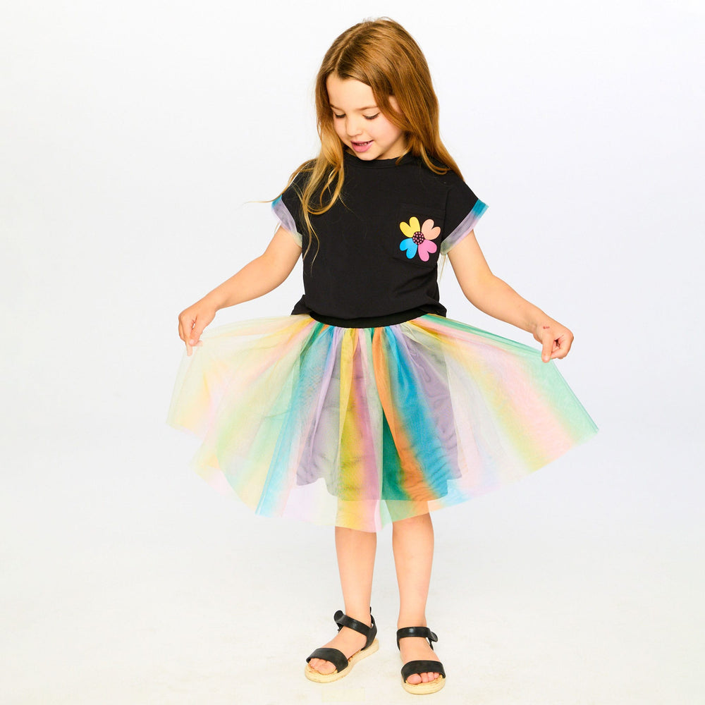 The bi-material dress in black brings a fun twist to everyday wear with its playful mix of textures. This short-sleeve dress combines a soft organic cotton jersey top with a rainbow-hued mesh skirt and features a round neckline, rainbow-colored sleeve borders and a small flower detail on the chest pocket. Made from a blend of breathable organic cotton with a polyester mesh skirt and lining, it ensures comfort and flair for every adventure.Sizes 2 and 3 years are designed without detachable 3D embellishments to ensure young children’s safety.