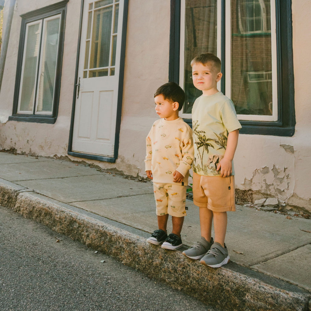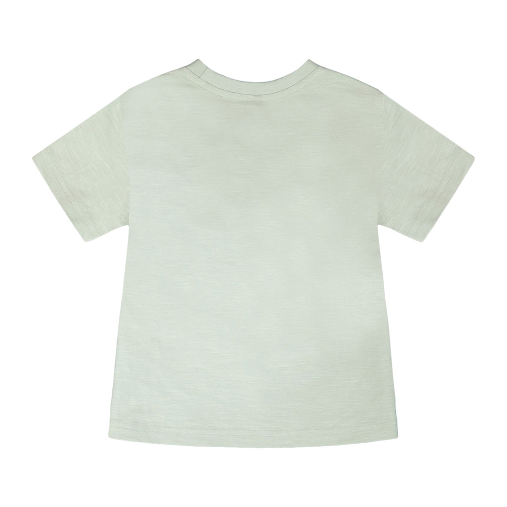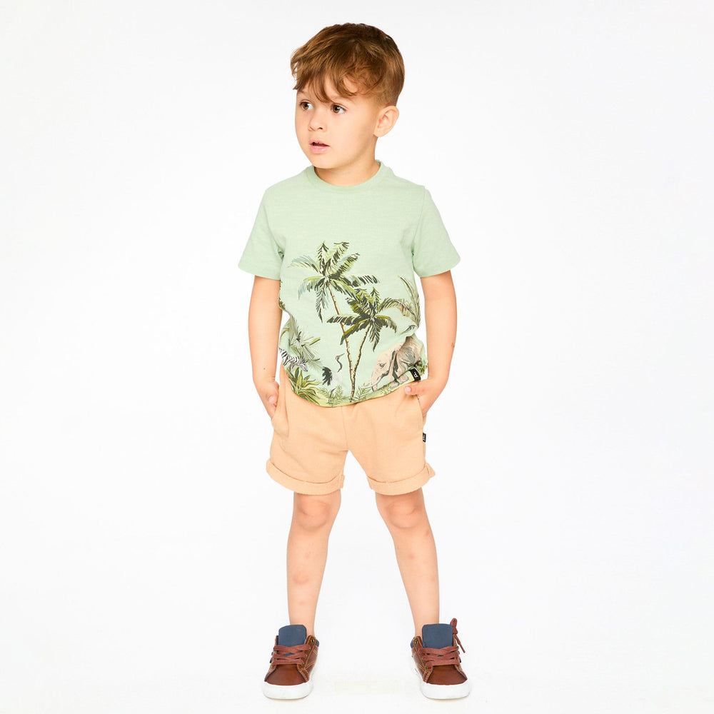 The organic cotton t-shirt in mint green with safari print brings the spirit of adventure to everyday outfits. This short-sleeve tee features a round neckline, and a detailed safari scene with palms, zebra, and elephant, crafted in soft organic cotton with a touch of elastane for comfort and flexibility. Pair it with shorts or pants from our "Trail Buddies" collection for a complete explorer look.