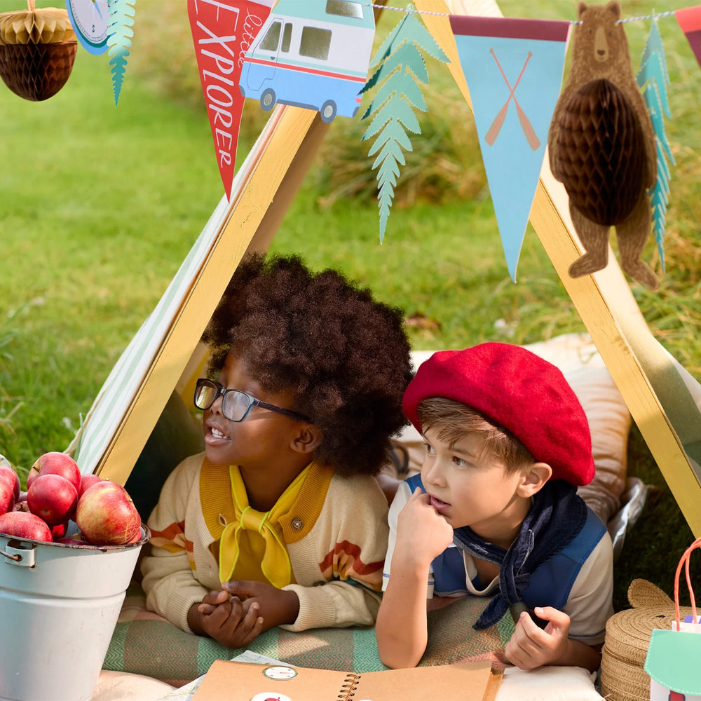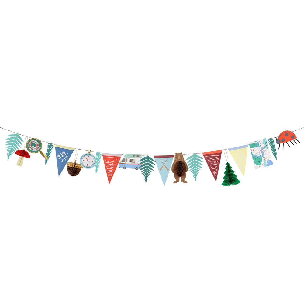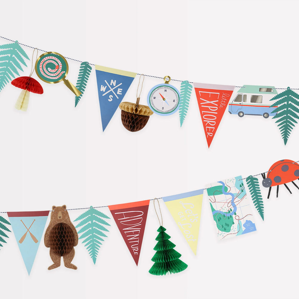 Let's go camping! Transform your party into an outdoor adventure with our camping-inspired range. Designed for little explorers and nature lovers to bring the magic of the great outdoors to your celebration. This statement garland, with retro summer-camp pennants and honeycomb embellishments, is perfect to decorate backyard gatherings, or hang indoors on the party table, wall or mantel for a cosy camping vibe. Just add s'mores, stories and party games for a fun time.