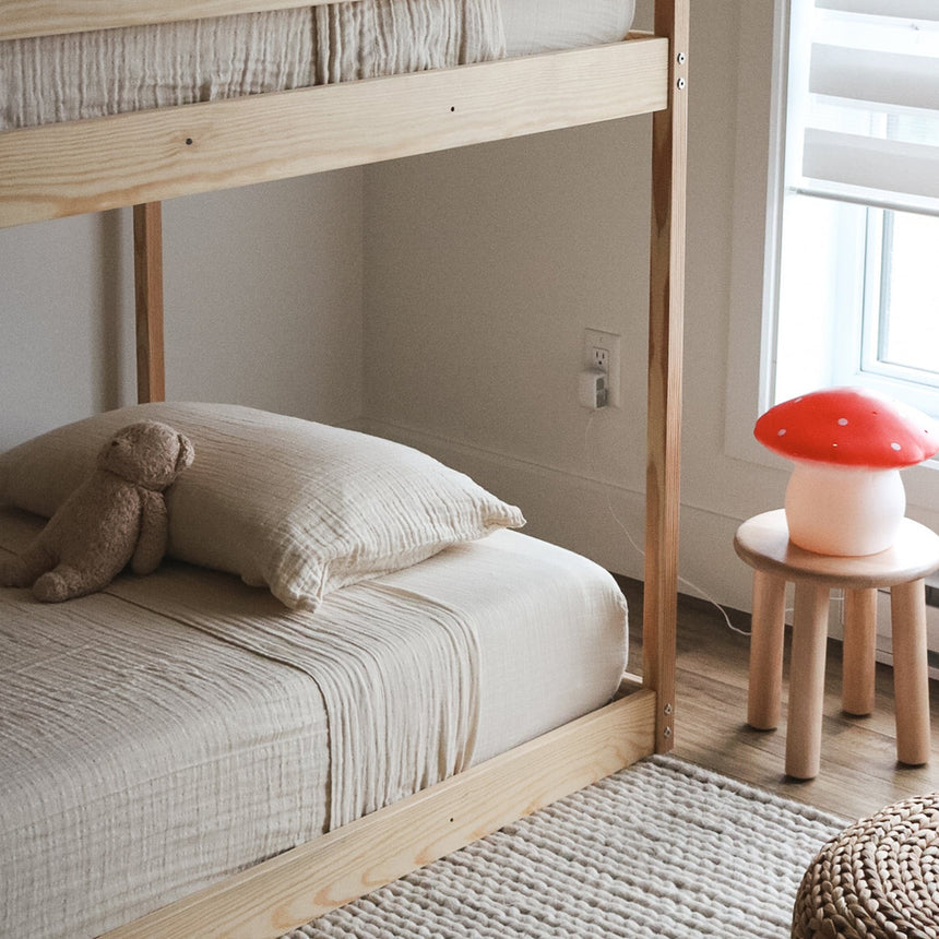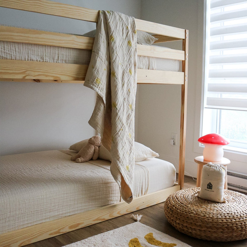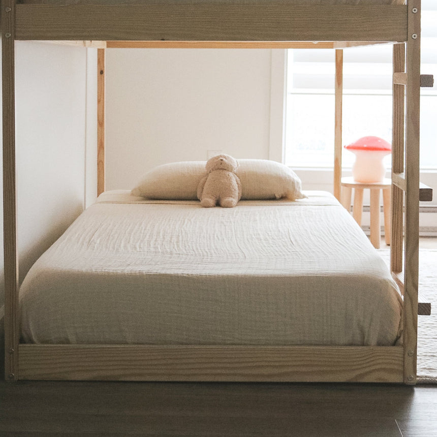 Our twin bed sheet set is made from 100% certified organic cotton muslin, meeting the strict standards of the Global Organic Textile Standard (GOTS) and Global Recycled Standard (GRS) certifications.