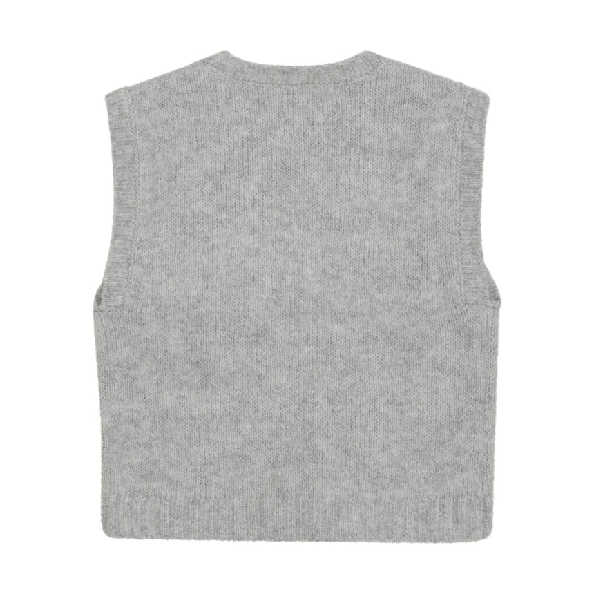 Smart knit slipover with writing on the front from Creamie. It has wide armholes and a round neckline, with a ribbed hem. In the armholes and at the bottom, there are wide ribbed edges. The slipover can be styled over a T-shirt, and is nice and warm on cold days.