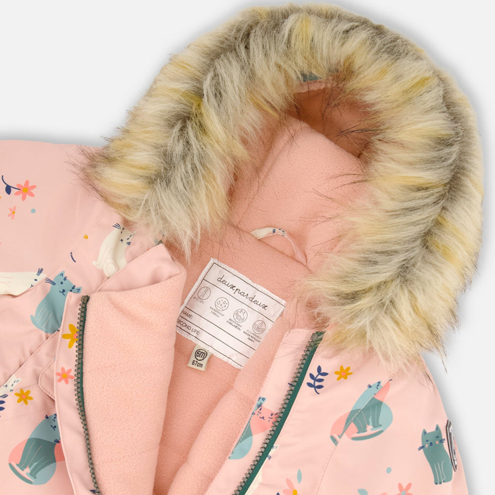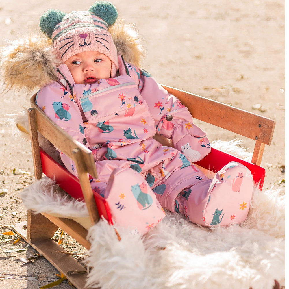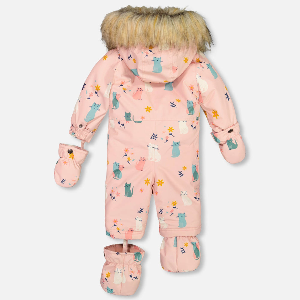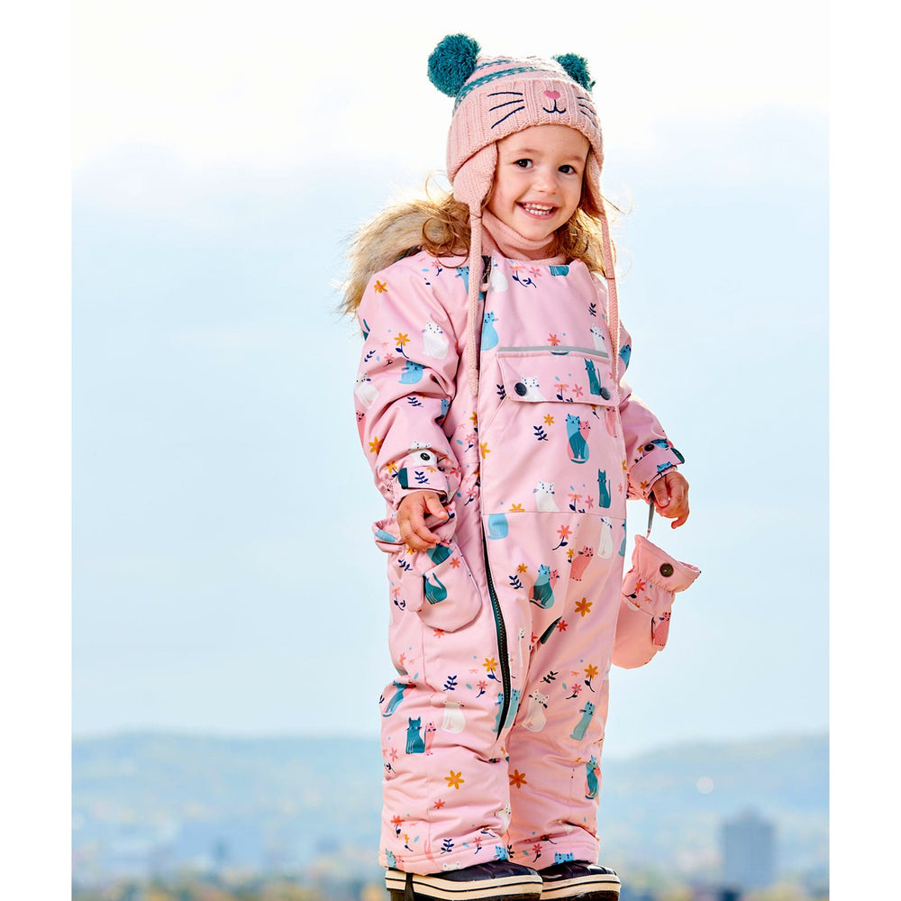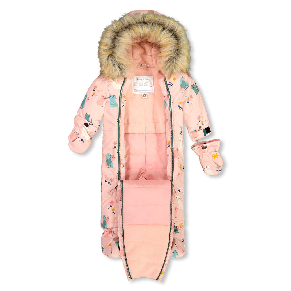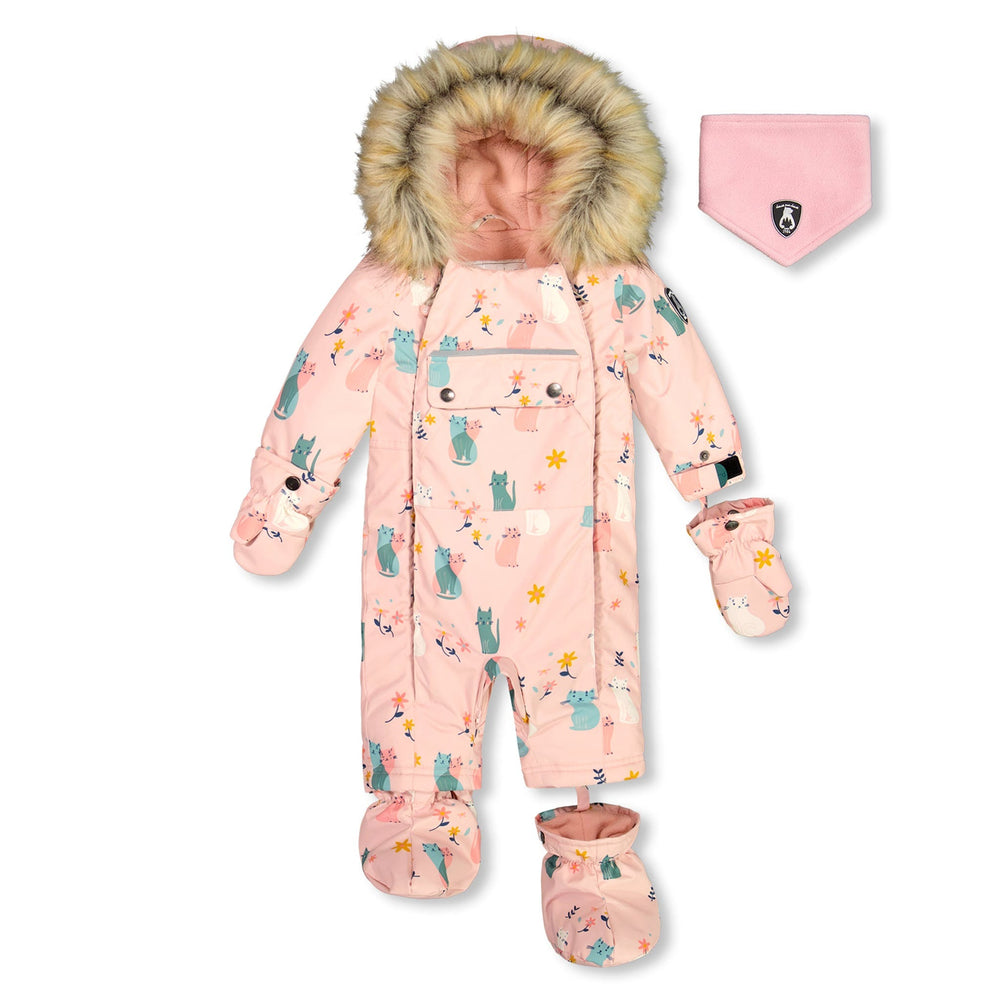 With a playful allover print, our One Piece Baby Snowsuit Light Pink Printed Cats Designed for Car Seat will keep your little one warm from head to toe! Designed for wearing in temperatures as low as -30° C (-22° F), this snowsuit is fully insulated and lined with fleece in the body and hood. It features an attached hood with removable faux fur trim, removable mittens and booties, a wind stopper placket and chin guard, and a matching neckwarmer for added warmth!