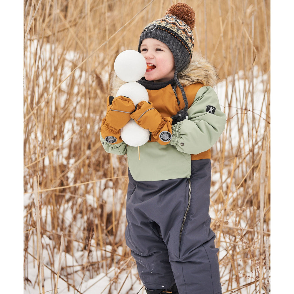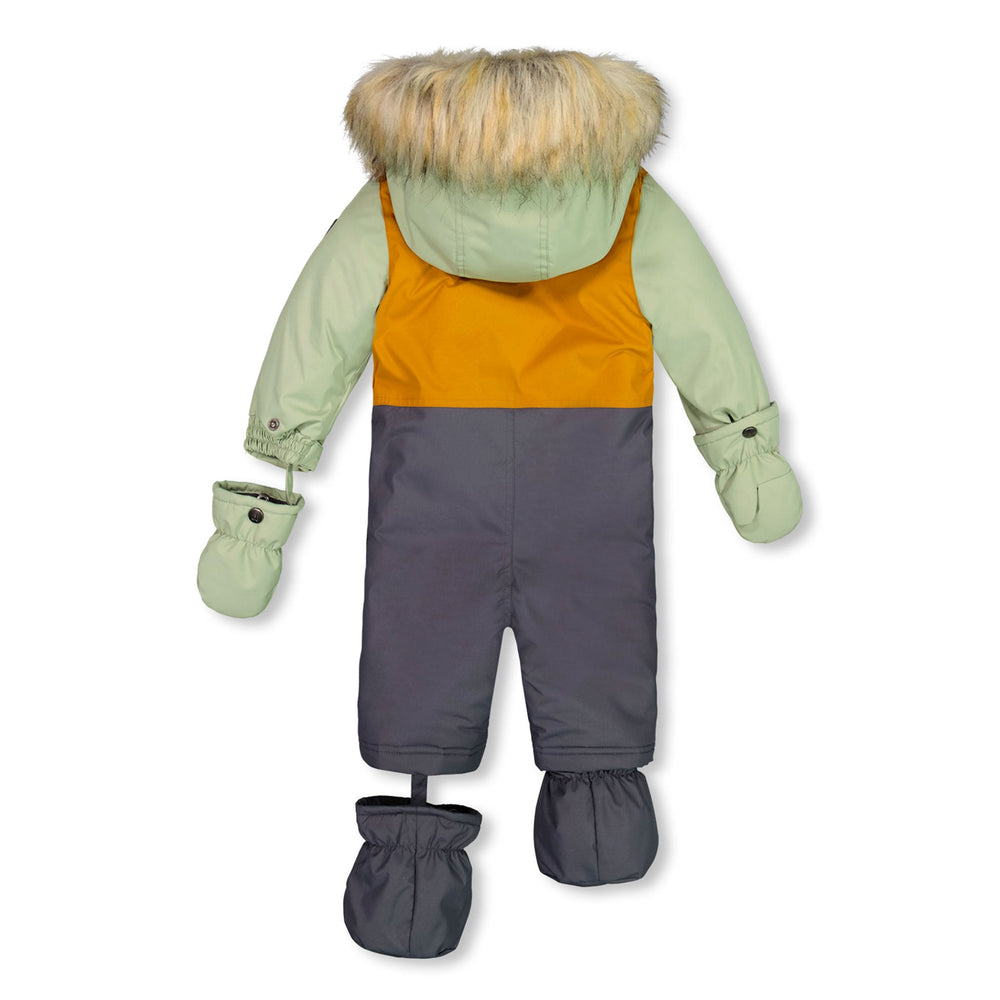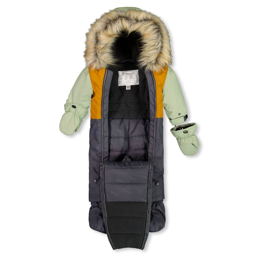 With a playful allover print, our One Piece Baby Snowsuit Sage Printed Wolves Designed for Car Seat will keep your little one warm from head to toe! Designed for wearing in temperatures as low as -30° C (-22° F), this snowsuit is fully insulated and lined with fleece in the body and hood. It features an attached hood with removable faux fur trim, removable mittens and booties, a wind stopper placket and chin guard, and a matching neckwarmer for added warmth!