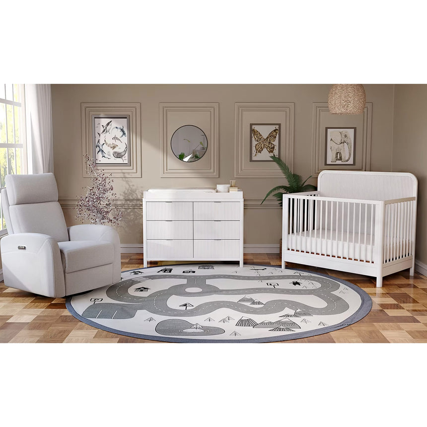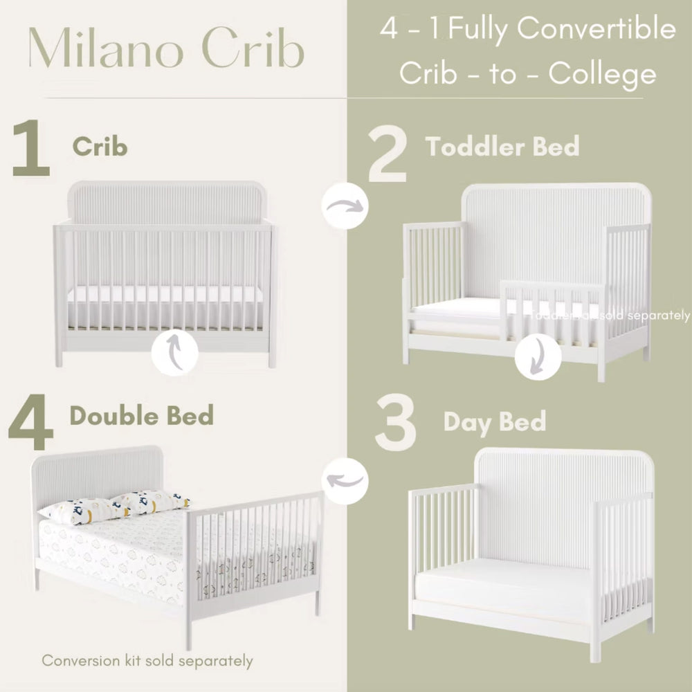 Milano Convertible Crib is a stunning blend of timeless design and modern practicality. Featuring a unique fluted pattern headboard and elegant curved lines this crib is more than just a place for your baby to sleep—it’s a statement piece that adds sophistication to your nursery.