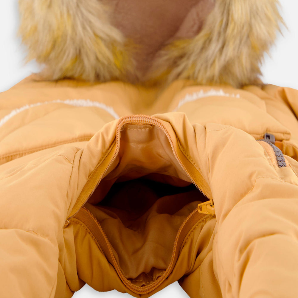 -Removable synthetic fur-trimmed hood with hood snow skirt