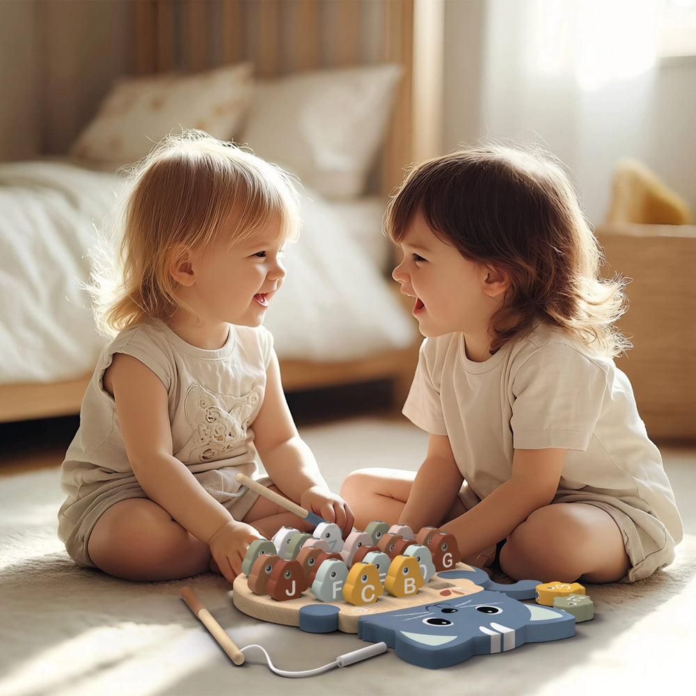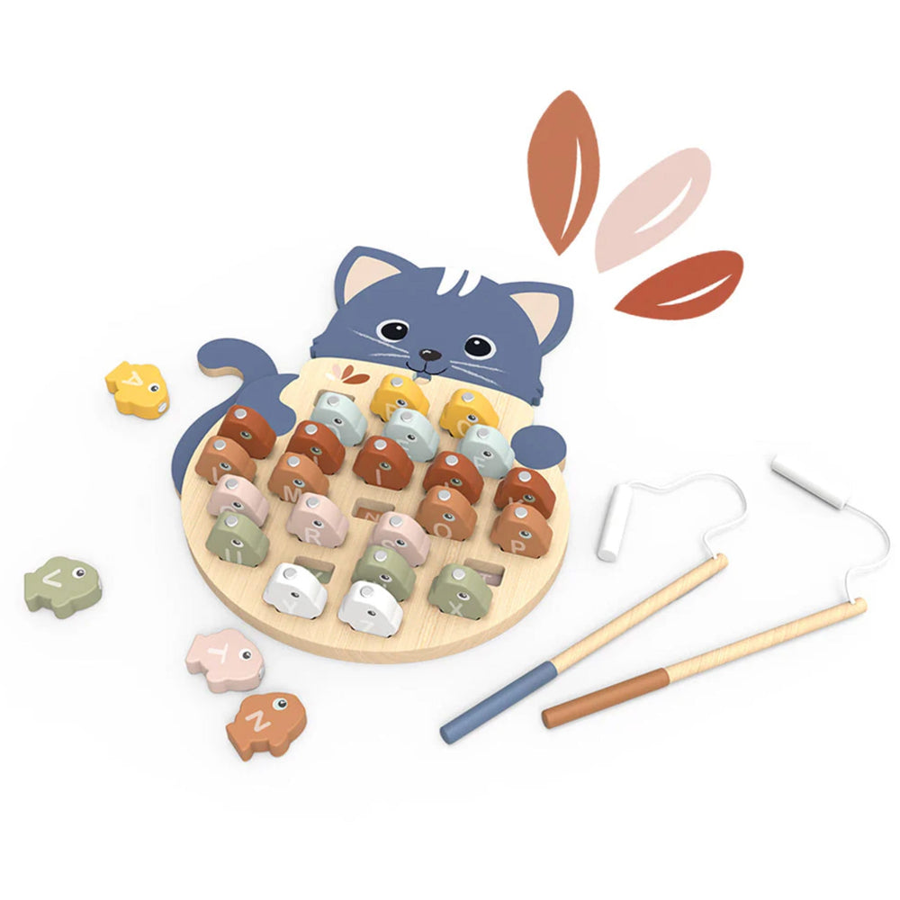 Each wooden fish features a brightly painted letter of the alphabet, helping children become familiar with letter shapes and sequencing in a playful, hands-on way. The magnetic fishing rods are easy to grip, encouraging hand-eye coordination and concentration.