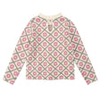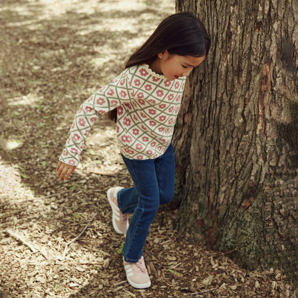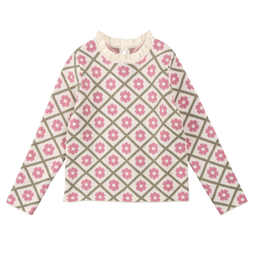This floral intarsia knit sweater adds a touch of timeless elegance to her everyday wardrobe. Made from 100% organic cotton, it’s both lightweight and cozy with a subtle retro vibe. A handy loop closure at the back makes dressing easy, and a delicate ruffle trims the neckline. Perfect for bringing color and softness to gray days.