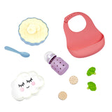 -Babi's feeding set includes: 1 bib, 1 bottle with lid, 1 bowl of oatmeal with bananas, 1 snack container with lid, 2 pieces of broccoli, 2 cookies and 1 spoon