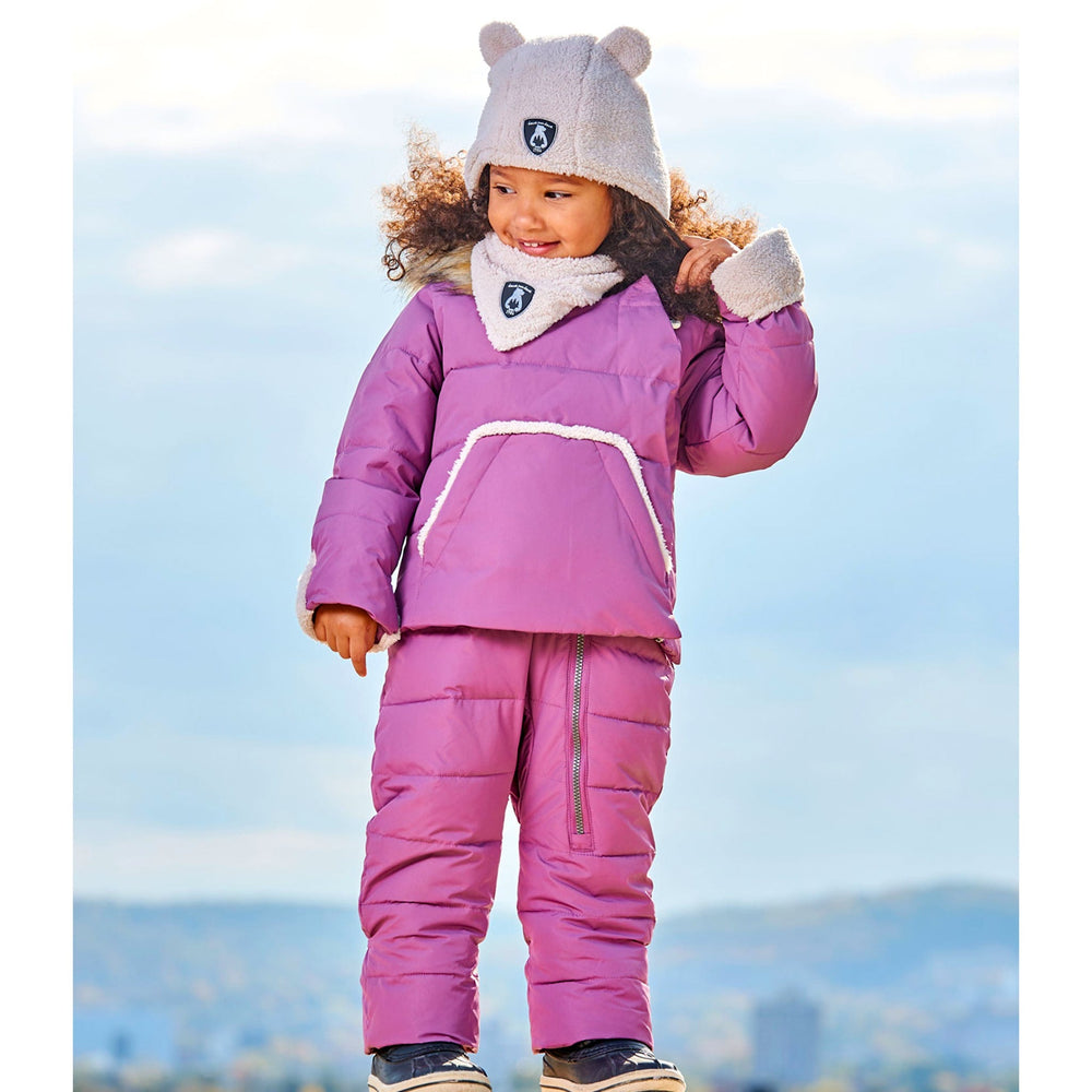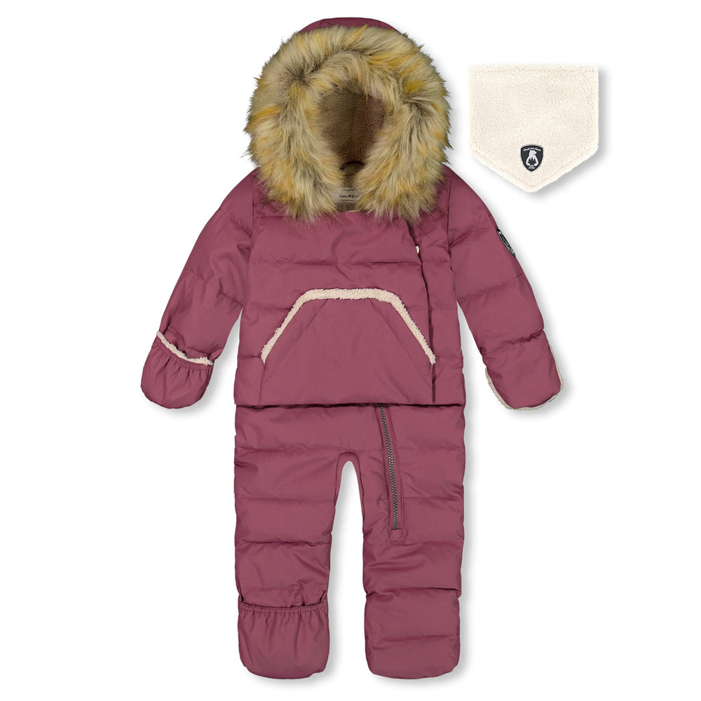 Insulated to keep little ones warm in temperatures as low as -30° C (22° F), our One Piece Baby Hooded Snowsuit Sage Printed Racoons Designed for Car Seat is a perfect choice on a frigid day! This plush-lined suit is detailed with a cozy sherpa-lined hood with removable faux fur trim, an asymmetrical zipper closure, and sherpa-lined flip over hands and feet for added warmth. The construction of the top allows for easy and safe attachment to car seat harness straps. A coordinating neckwarmer is included!