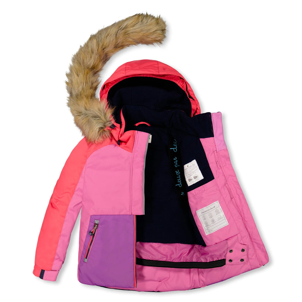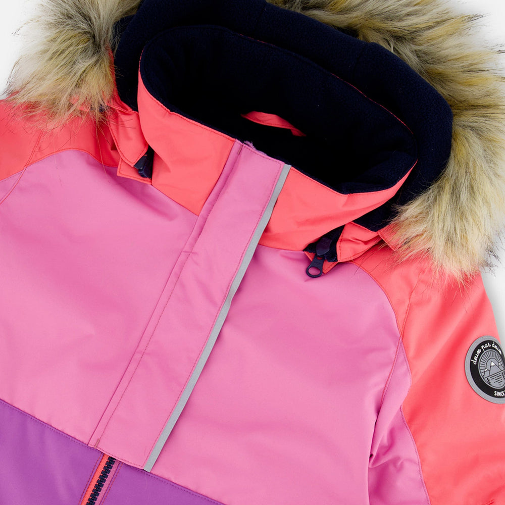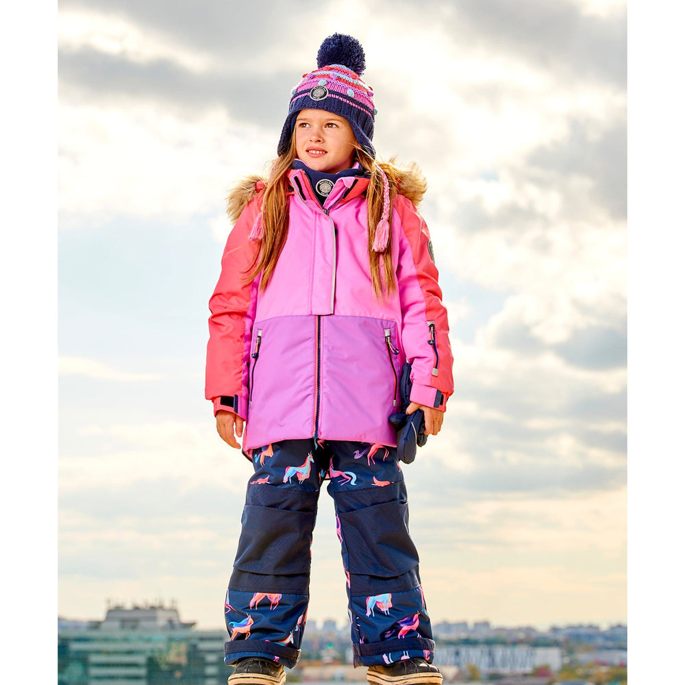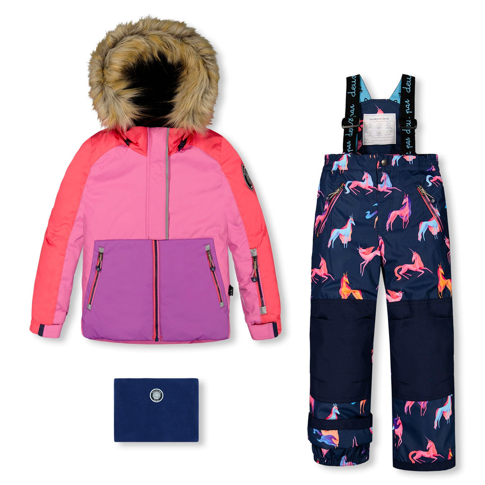 With a colorblocked jacket and an allover unicorn print pant, our Two Piece Snowsuit Colorblock Purple and Coral with Printed Unicorns is perfect for the girl who loves spending time in the snow! Insulated and coated for weather resistance, the coat features a cozy fleece lining, evolutive sleeves, a zip front closure with a wind stopper placket, and a detachable hood with faux fur trim. The pant is detailed with adjustable, removable logo straps, reinforced panels at the knees, seat, and hem, and reflective accents for increased visibility. A coordinating neckwarmer is included for added warmth!