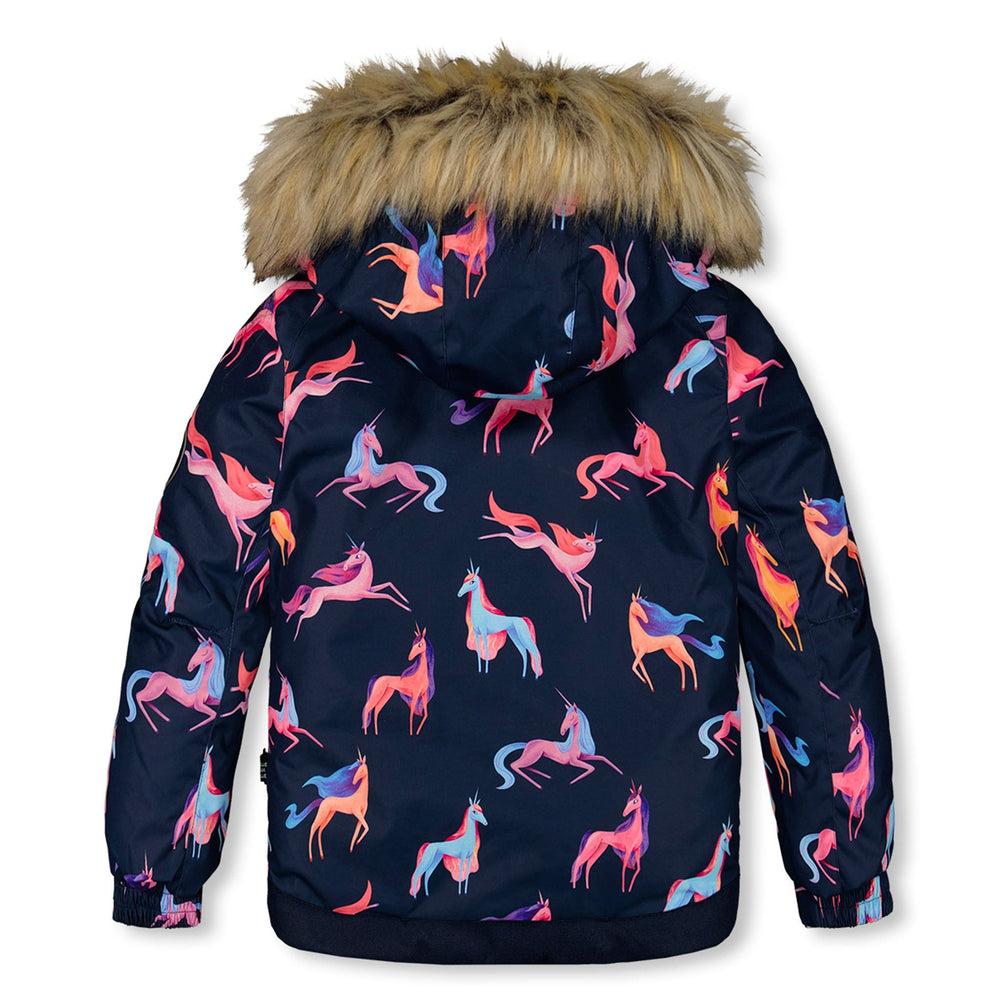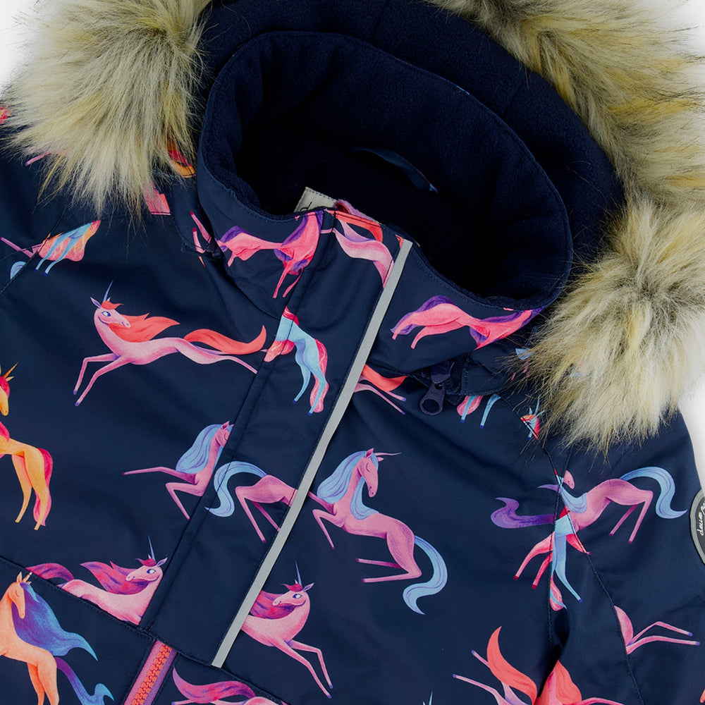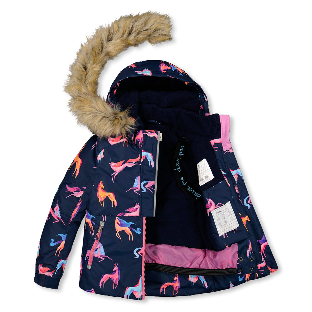 With a colorblocked jacket and an allover unicorn print pant, our Two Piece Snowsuit Colorblock Purple and Coral with Printed Unicorns is perfect for the girl who loves spending time in the snow! Insulated and coated for weather resistance, the coat features a cozy fleece lining, evolutive sleeves, a zip front closure with a wind stopper placket, and a detachable hood with faux fur trim. The pant is detailed with adjustable, removable logo straps, reinforced panels at the knees, seat, and hem, and reflective accents for increased visibility. A coordinating neckwarmer is included for added warmth!