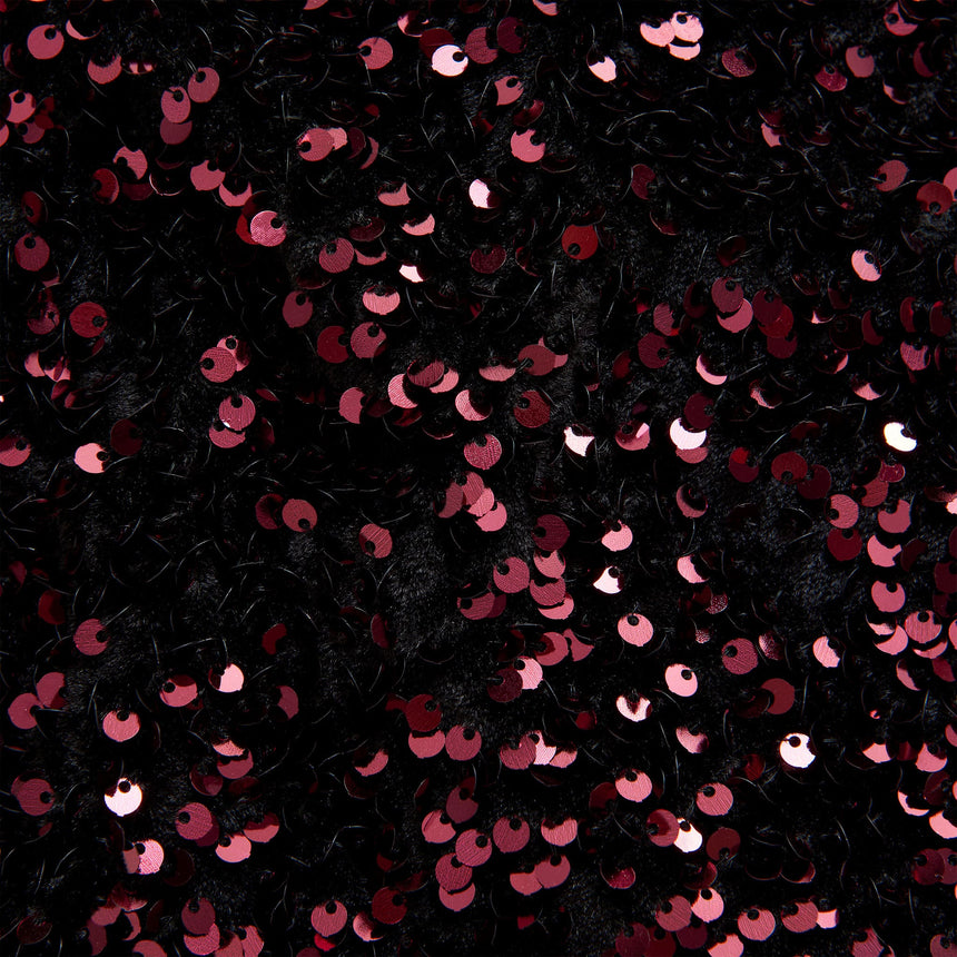 Festive red sequined dress from Creamie. Sequins are sewn onto a base of black velor fabric throughout the dress. The dress has a simple shape with short sleeves, has a bit of flare and closes with a button at the back. Cool for every party.