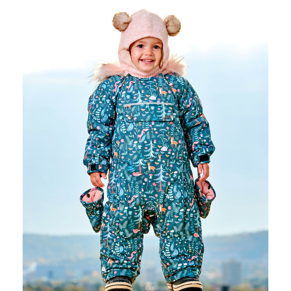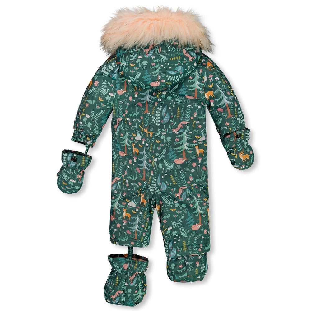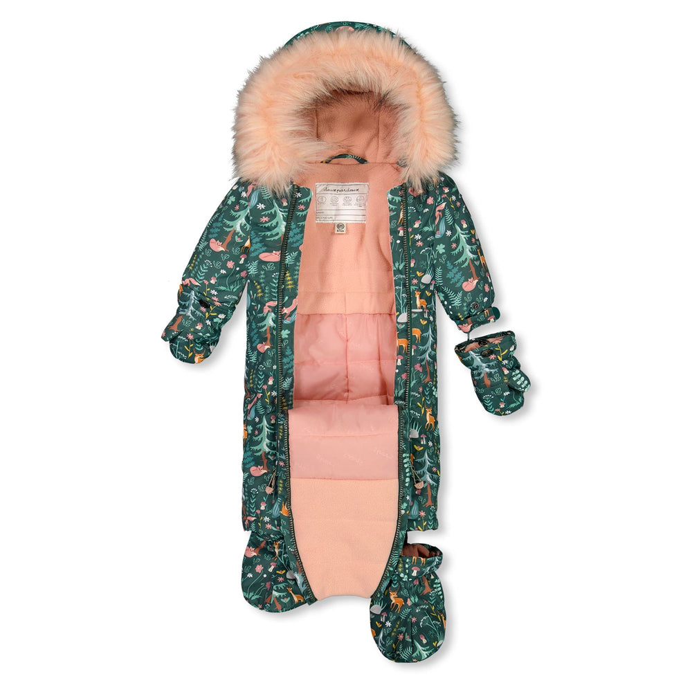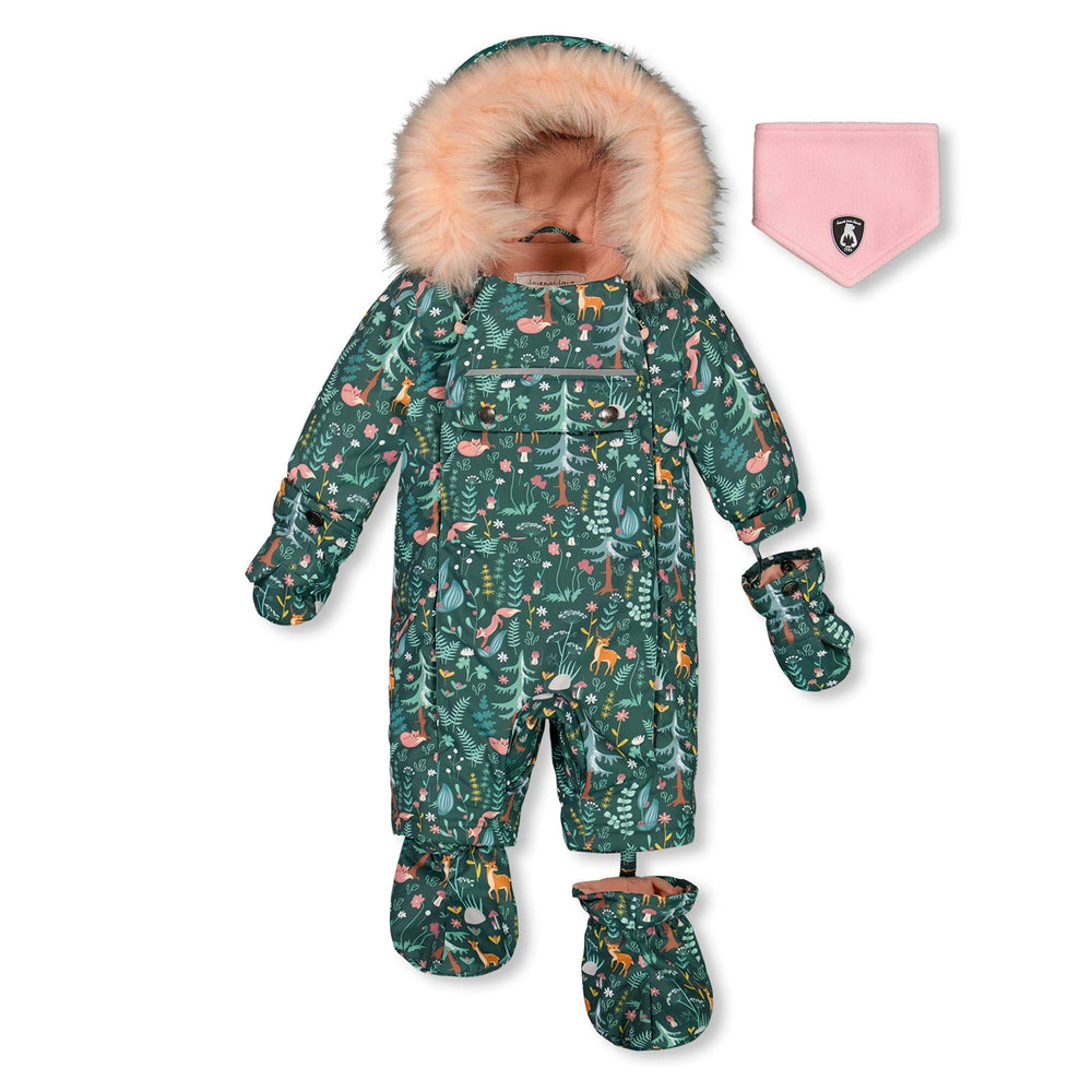 With a playful allover print, our One Piece Baby Snowsuit Sage Printed Woodland Animals Designed for Car Seat will keep your little one warm from head to toe! Designed for wearing in temperatures as low as -30° C (-22° F), this snowsuit is fully insulated and lined with fleece in the body and hood. It features an attached hood with removable faux fur trim, removable mittens and booties, a wind stopper placket and chin guard, and a matching neckwarmer for added warmth!