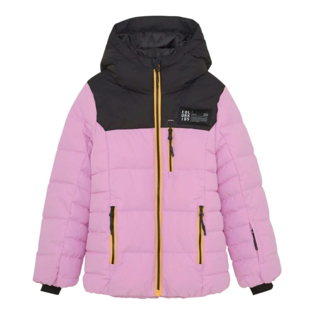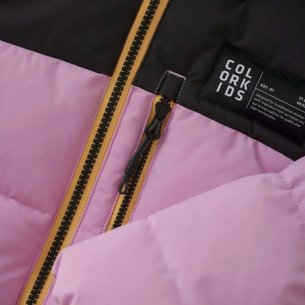 Veste de ski chaude et matelassée pour fille en matière résistante. Le matériau est respirant, coupe-vent et imperméable, afin que votre enfant puisse sortir sous la pluie, la neige et le vent sans avoir froid et être mouillé. Résistance à l'usure testée de 60 000 frottements, pression de colonne d'eau de 15 000 mm. et une respirabilité de 8 000 g. La veste se ferme avec un zip de qualité sur le devant et possède une poche poitrine et deux poches avant. La mentonnière garantit que la fermeture éclair ne gêne pas sous le menton. La veste a une capuche fixe qui peut être ajustée avec une bande velcro à l'arrière de la capuche et des poches extérieures zippées. Détails réfléchissants au dos de la veste et sur la manche. D'autres caractéristiques pratiques telles que des poignets intérieurs avec espace pour le pouce et des poignets extérieurs réglables qui peuvent être fermés hermétiquement. Poche pour carte de remontée dans la manche gauche et à l'intérieur. Il y a une étiquette nominative à l'intérieur. La veste de ski est fabriquée à partir de matériaux recyclés. Enduit de BIONIC FINISH® ECO Certifié selon. conforme à GRS - Fabriqué avec 53 % de matériaux recyclés CERES-0366. Color Kids est une marque Danoise de vêtements d'extérieur qui s'inspire de notre nature. Color Kids vise à être une marque durable et à contribuer à sauver notre environnement. Plus de 70 % des produits Color Kids sont fabriqués à partir de tissus recyclés fabriqués à partir de bouteilles en plastique.