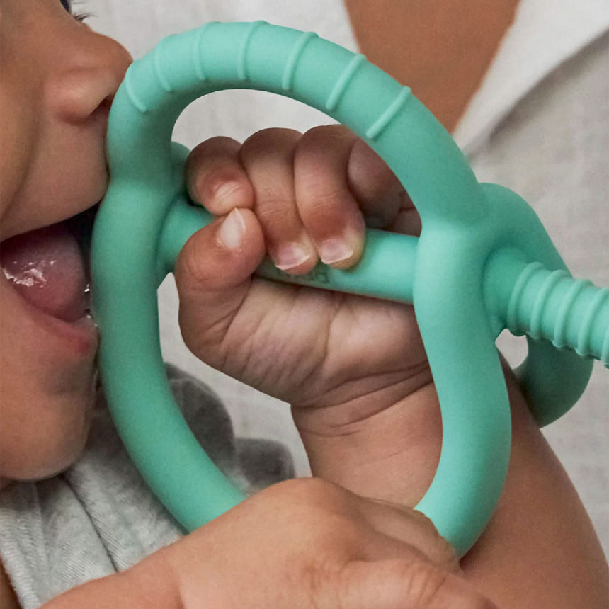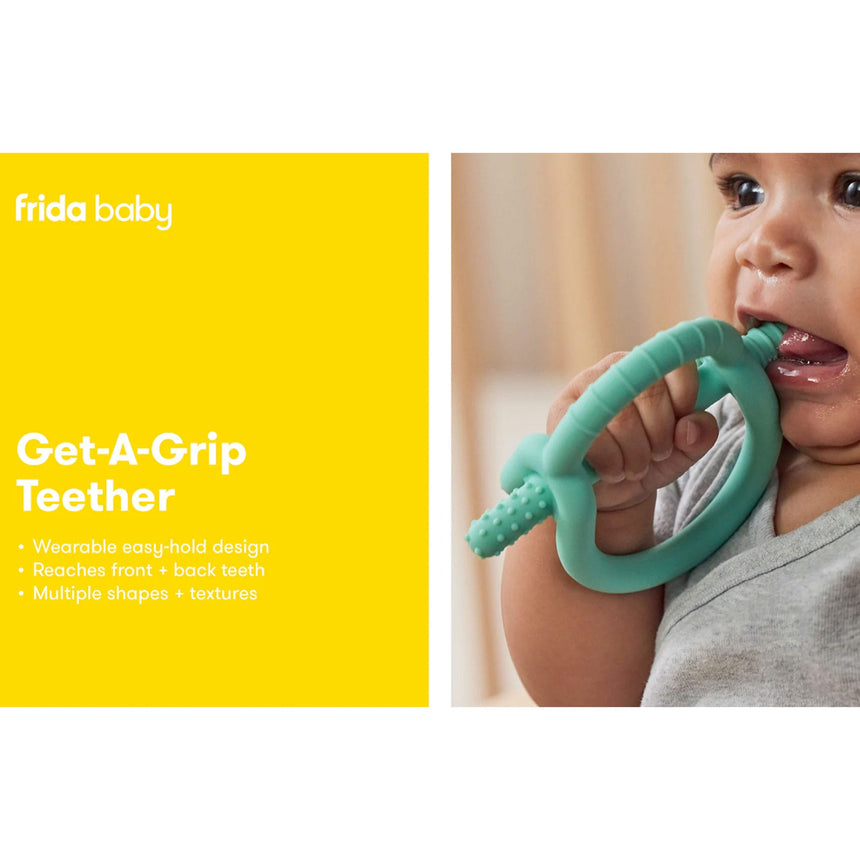 Help your baby drop the tantrums, not their teether. The Get-A-Grip Teether has a bar handle that engages your baby's natural grasp reflex and a wrist-hugging design for a more secure hold that prevents accidental tossing and dropping. Made from 100% food-grade silicone, it's a teether toy with multiple shapes that reach front, back, and all new teeth types, and different textures that provide soothing relief for sore gums. From first teeth to mini molars, it's so good they won't want to put it down.