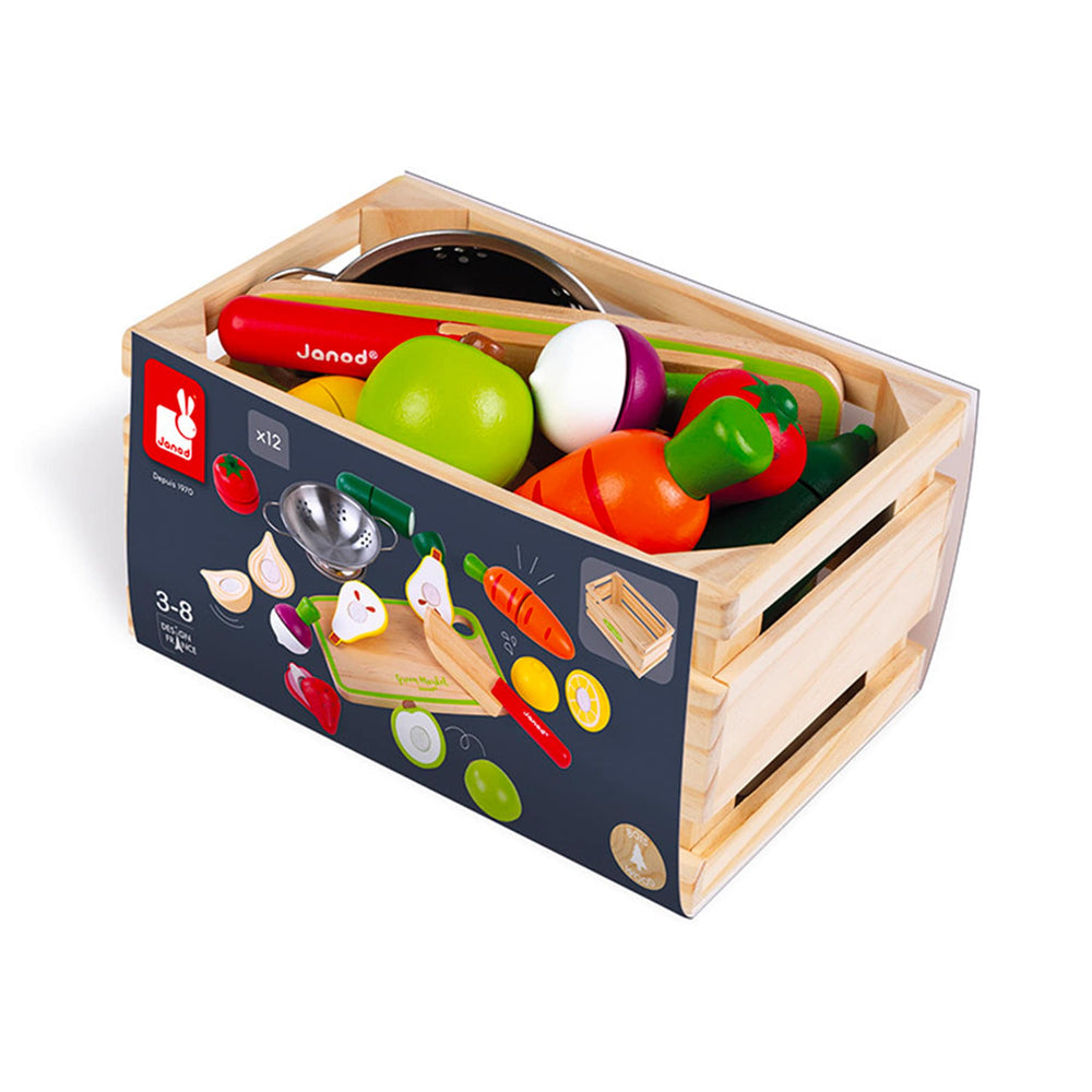 Cut, slice, chop! Children also want to start cooking, but in complete safety thanks to this maxi set of wooden fruit and vegetables to cut up! Maxi? Why ? Because there are 9 foods that children from 3 years old will be able to practice cutting endlessly! Indeed, the different parts are attached to each other thanks to hook and loop fasteners, which also makes it possible to have fun mixing fruits and vegetables! When they return from the market, children will find in their wooden crate: courgette, carrot, tomato, turnip, pear, lemon, apple and strawberry, enough to imagine good balanced dishes! The metal colander, the knife and the wooden cutting board included in this set will be used in the kitchen. The board has a nice inscription 'Green market', Green Market being the name of the range of these fresh and vitaminized toys! By having fun with these fruits and vegetables, children will develop both their fine motor skills and their dexterity by handling each piece and they will also work their imagination by projecting themselves in the craziest kitchen creations!