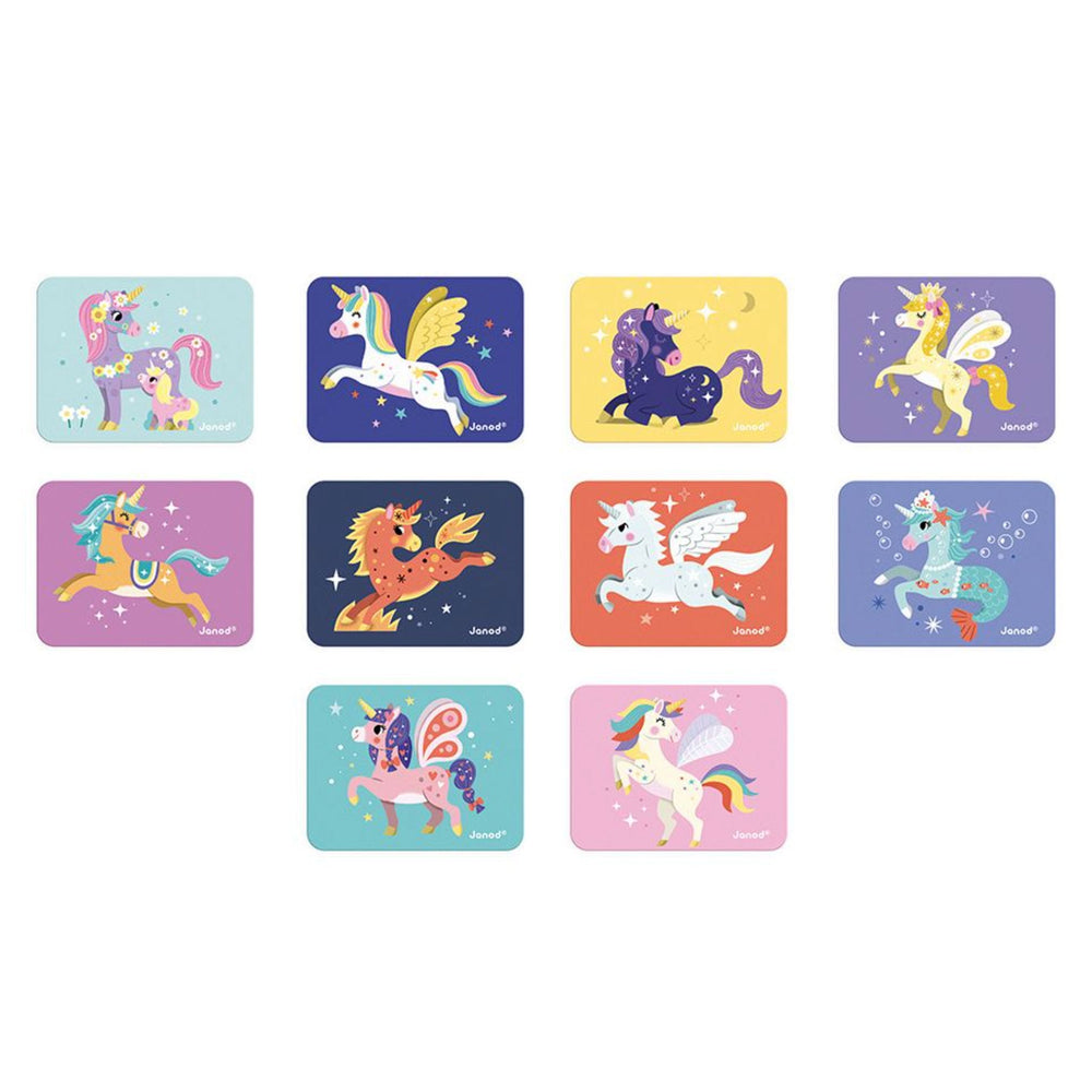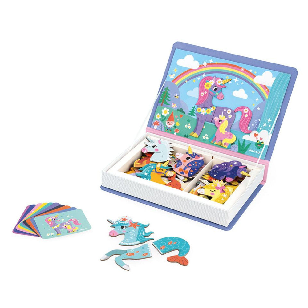 Majestic and fantastical unicorns are simply magical! This magnetic educational game will immerse children aged 3 years and up in fairyland. Imagination stimulation is a key stage in a child's development: with the help of this Magnéti'book, your little one will be prompted to invent countless stories. They can either refer to the models and colourful illustrations, or invent their own stories from scratch, by mixing the magnets as they see fit. This magnetic game consists of 44 magnetic pieces and 10 fantastically-illustrated models. Each unicorn has their own setting. The various decorations and many magnets allow for countless hybrid options. A winged or finned unicorn, in a meadow or the sky... everything goes! Many enchanted worlds are within easy reach of your children. Your children's fine motor skills will be stimulated by handling the magnets. In fact, they are easy for little ones to grasp. This book-sized magnetic toy is ideal for taking anywhere. In fact, the only limit is their imaginations once they cross the threshold. This fantasy-based magnetic game belongs to a large family of Janod Magnéti'book products: there are animals, occupations, firefighters and more. This magnetic educational game is made from FSC™-certified cardboard, in addition to controlled materials.