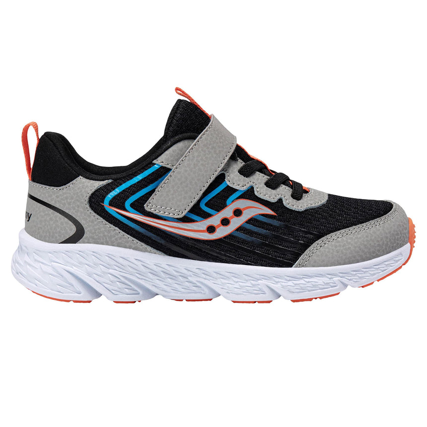 Get ready for every little adventure with the Saucony Wind 3.0 Sneaker in Black/Grey! The secure strap makes them easy to slip on, while the grippy sole ensures steady steps on every run and jump. Perfect for kids who love to move fast and play hard with the wind cheering them on!