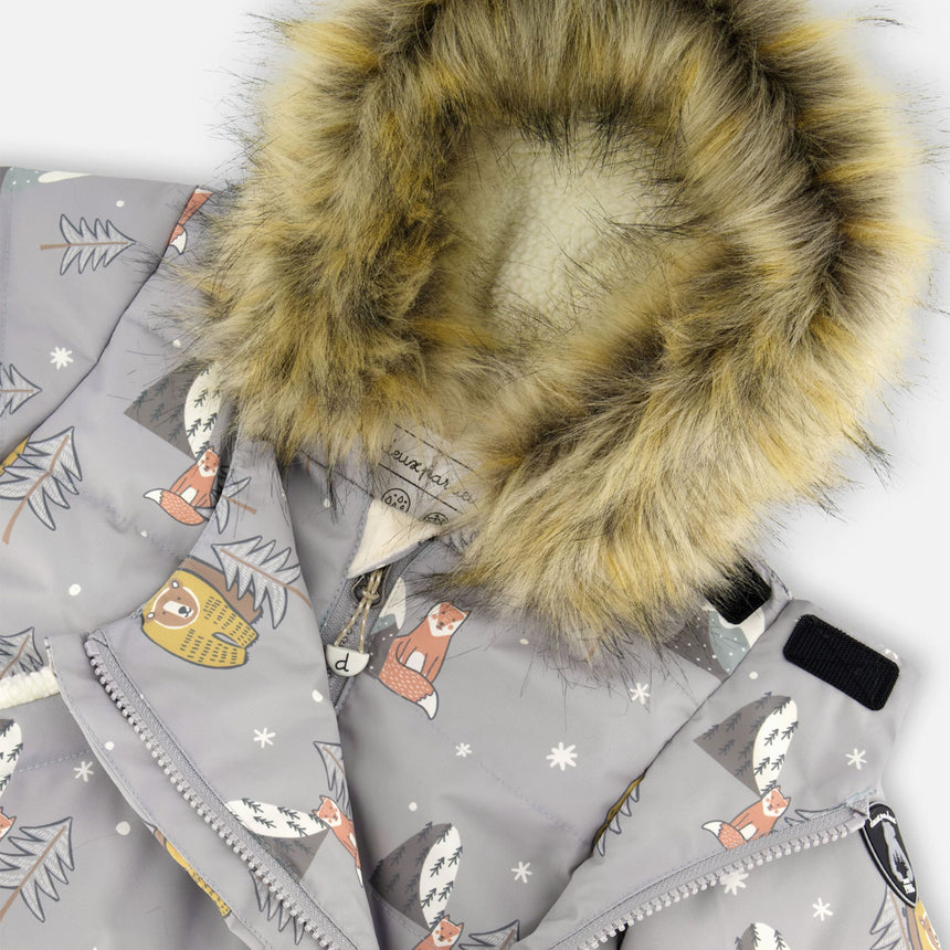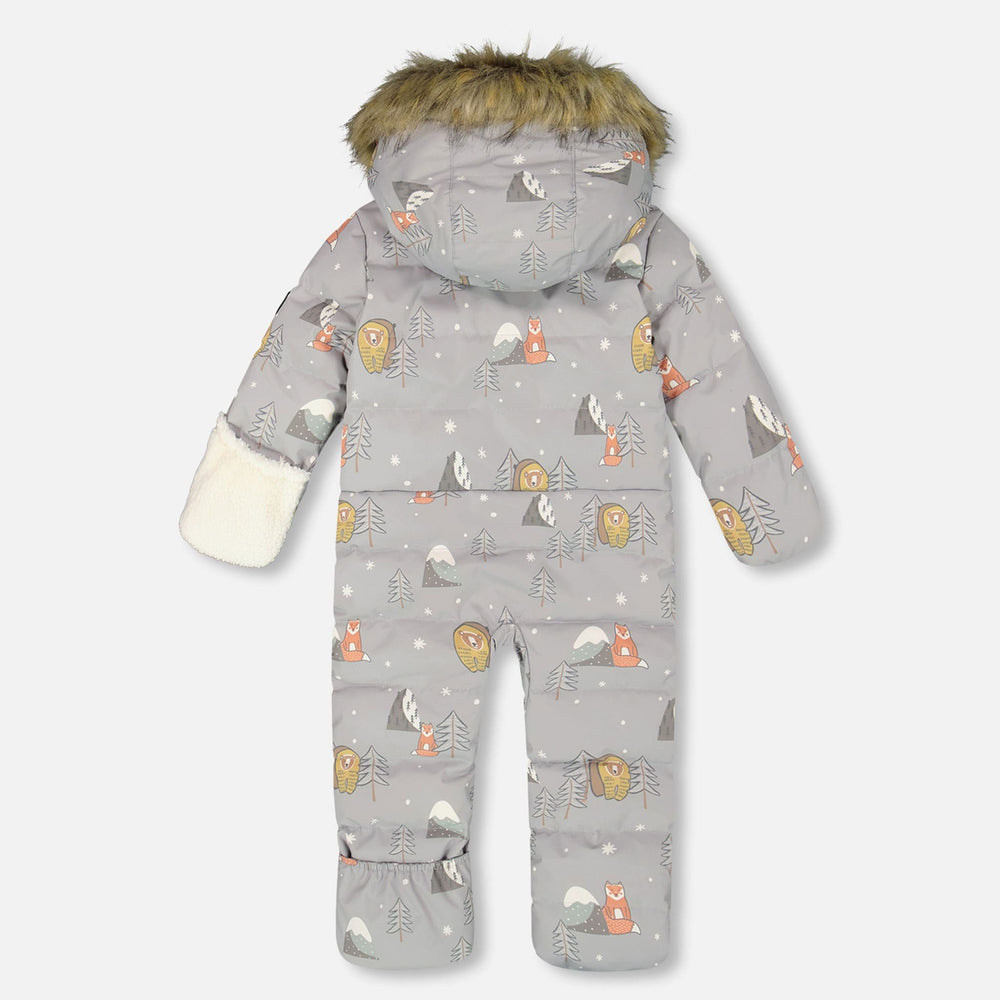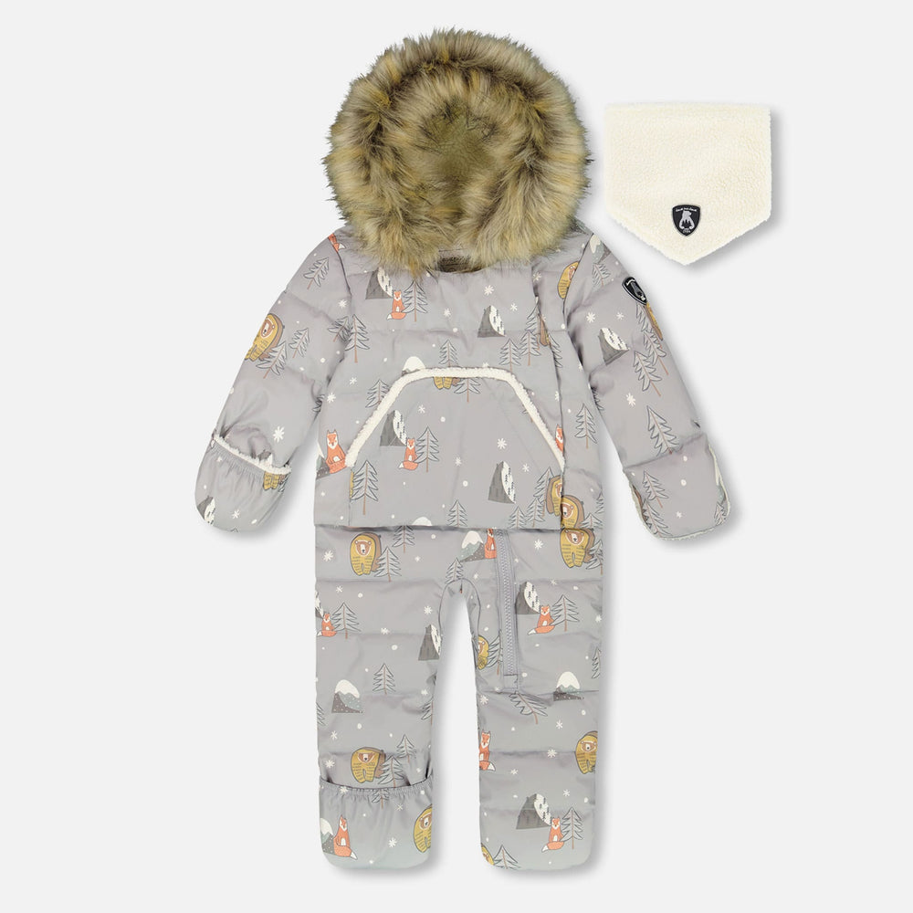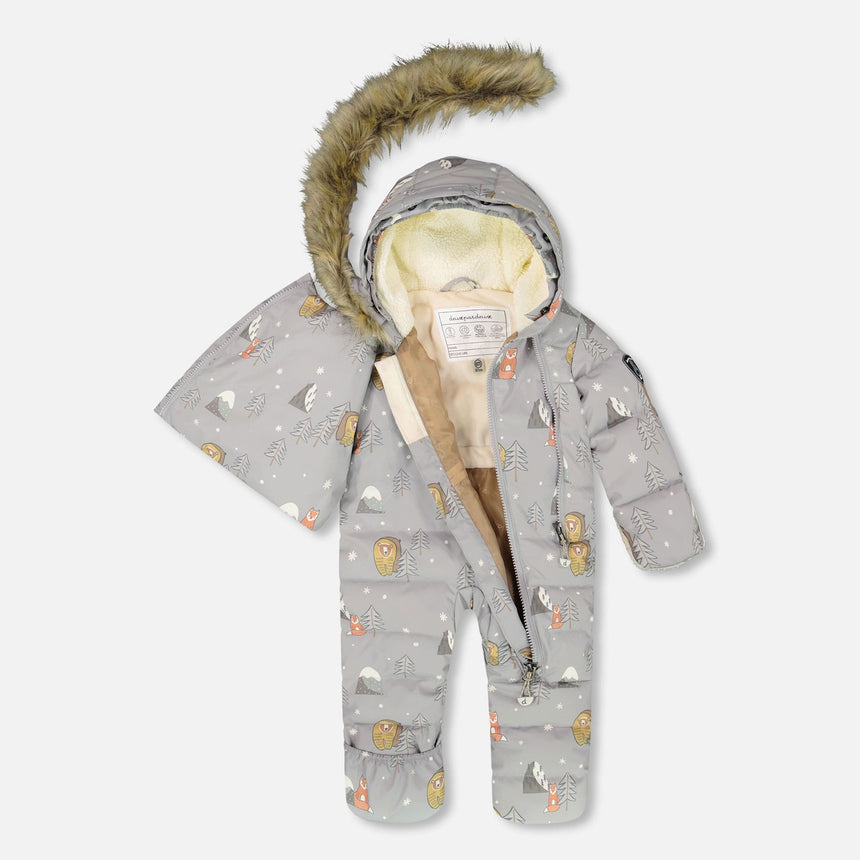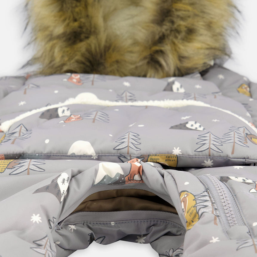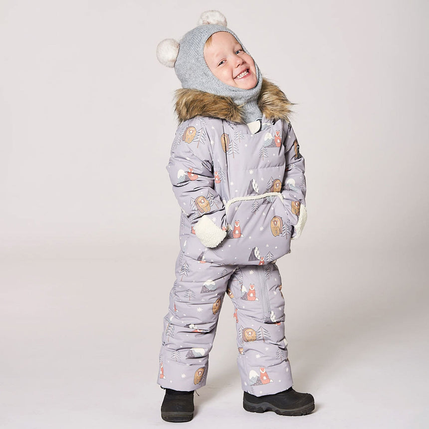 With thin, compressible insulation for warmth in temperatures down to -20°C (-4°F), our BABY SNUG winter suit is designed for maximum protection and comfortable breathability. Detailed with a waterproof coating to keep little ones dry, this purple bear print snowsuit features horizontal quilting with a sherpa-lined hood, a velour-lined body, water resistant zippers, and a wind flap and chin guard to keep the cold out. An adjustable waistband, foldover hand and foot openings, and car seat compatible construction ensure that baby is safe and warm whether they're out in the elements or strapped in the car.
