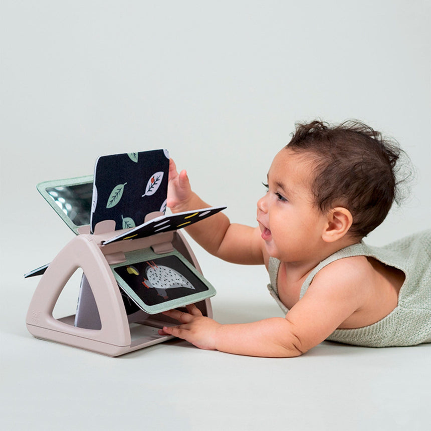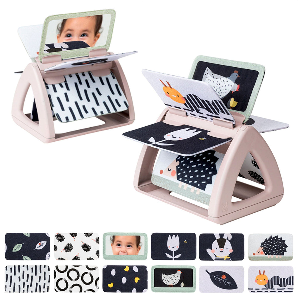 -A double-sided tummy-time spinning baby book for 3 developmental stages with 10 pages of black & white illustrations, 1 unique hologram page and a baby-safe mirror.