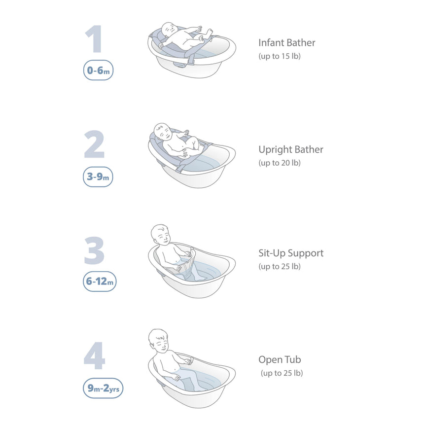 4 Grow-With-Baby Stages: Infant Bather (0-6m; up to 15 lbs/7 kg; Upright Bather (3-9m; up to 20 lbs/9 kg); Sit-up Support (6-12m; up to 25 lbs/11,5 kg); Open Tub (9m-2yrs; up to 25 lbs/11,5 kg)